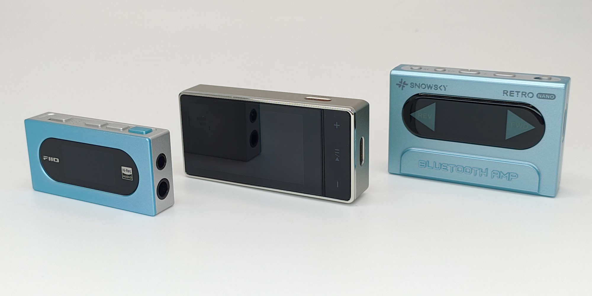 Размеры ЦАПа: длина — 64,2 мм, ширина — 30,7 мм и толщина — 13 мм. Весит ЦАП, а точнее моя версия с корпусом из алюминиевого сплава, 39,2 грамма. Карбоновая версия полегче и весит уже 33,7 грамма. ЦАП получился, в общем, не сказать, что крупный, но и не компактный, если сравнивать, например, с тоже довольно мощным ЦАПом помладше FiiO Jade Audio KA15. Ну и для сравнения еще Bluetooth ЦАП/усилитель, который также может и по проводу FiiO Snowsky RETRO NANO.