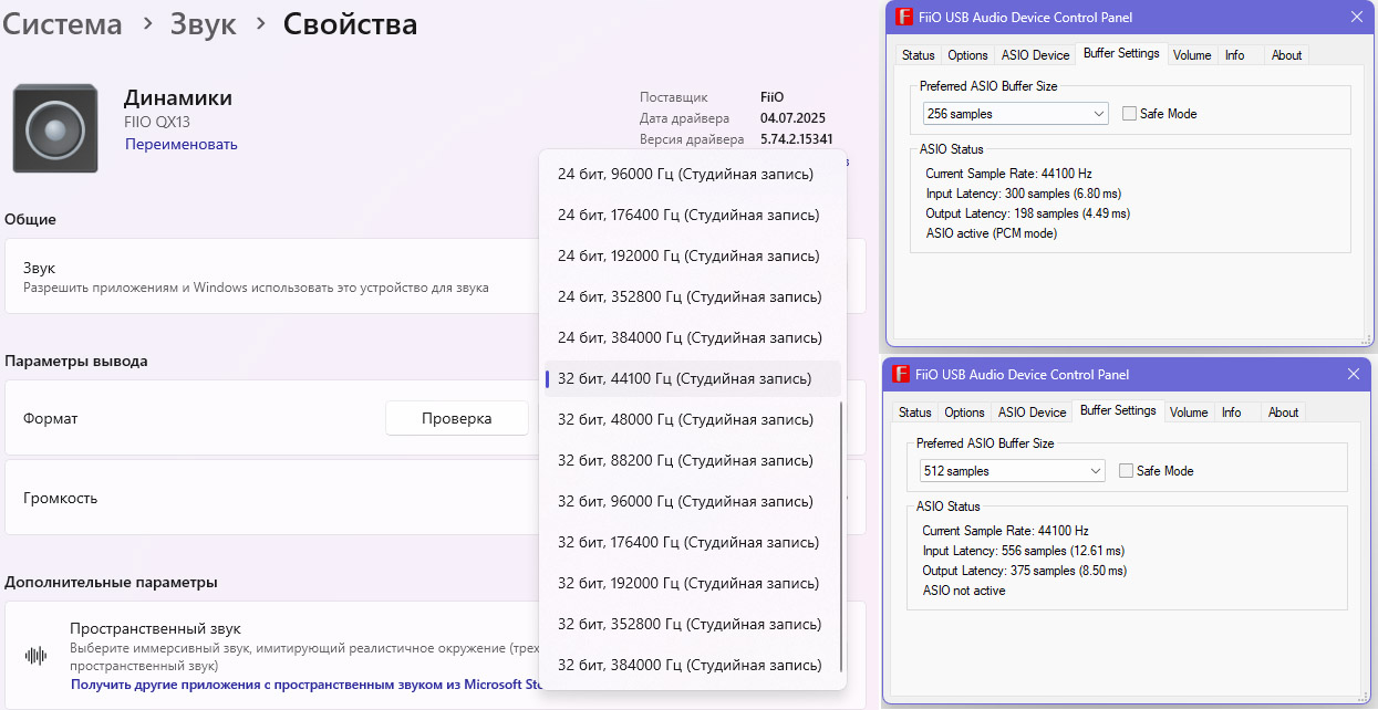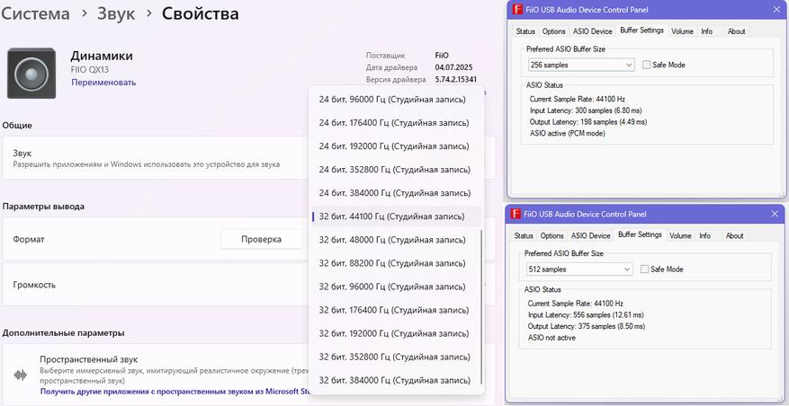 Установленная у меня операционная система Windows 11 Pro не поддерживает 768 kHz, и поэтому можно выбрать всё до 384 kHz/32 bit включительно. Опять FiiO большие молодцы, что добавили поддержку собственного ASIO драйвера с низкими задержками. В этом плане ЦАП подойдет музыкантам для использования с музыкальным софтом, и плюсом еще можно будет сделать коррекцию АЧХ наушников или рум-коррекцию для акустической системы. Последнее, в общем, можно сделать не только музыкантам, но и просто меломанам.