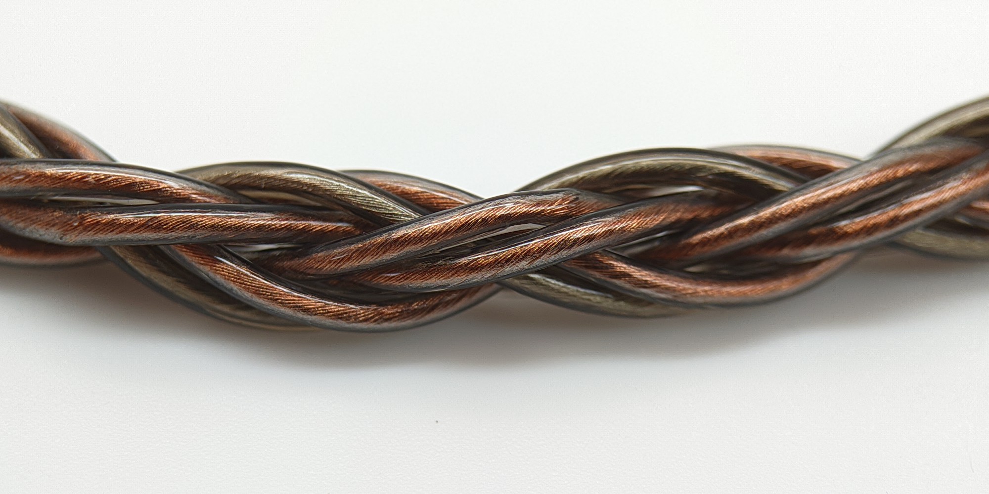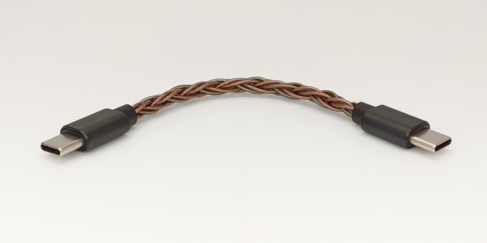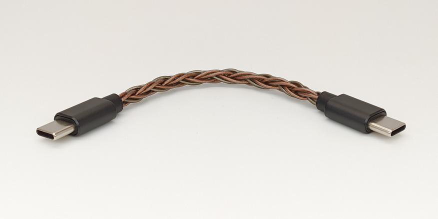 Комплектный кабель для подключения ЦАПа выглядит солидно. Сплетенный из восьми жил, он упругий, сопротивляется на излом, но достаточно эластичный, чтобы это не мешало им пользоваться. Длиной он 13 сантиметров, включая разъемы. Защиты от перегибов на корпусах разъемов не предусмотрено. Переходника с Type-C на обычный разъем USB-A нам не положили.