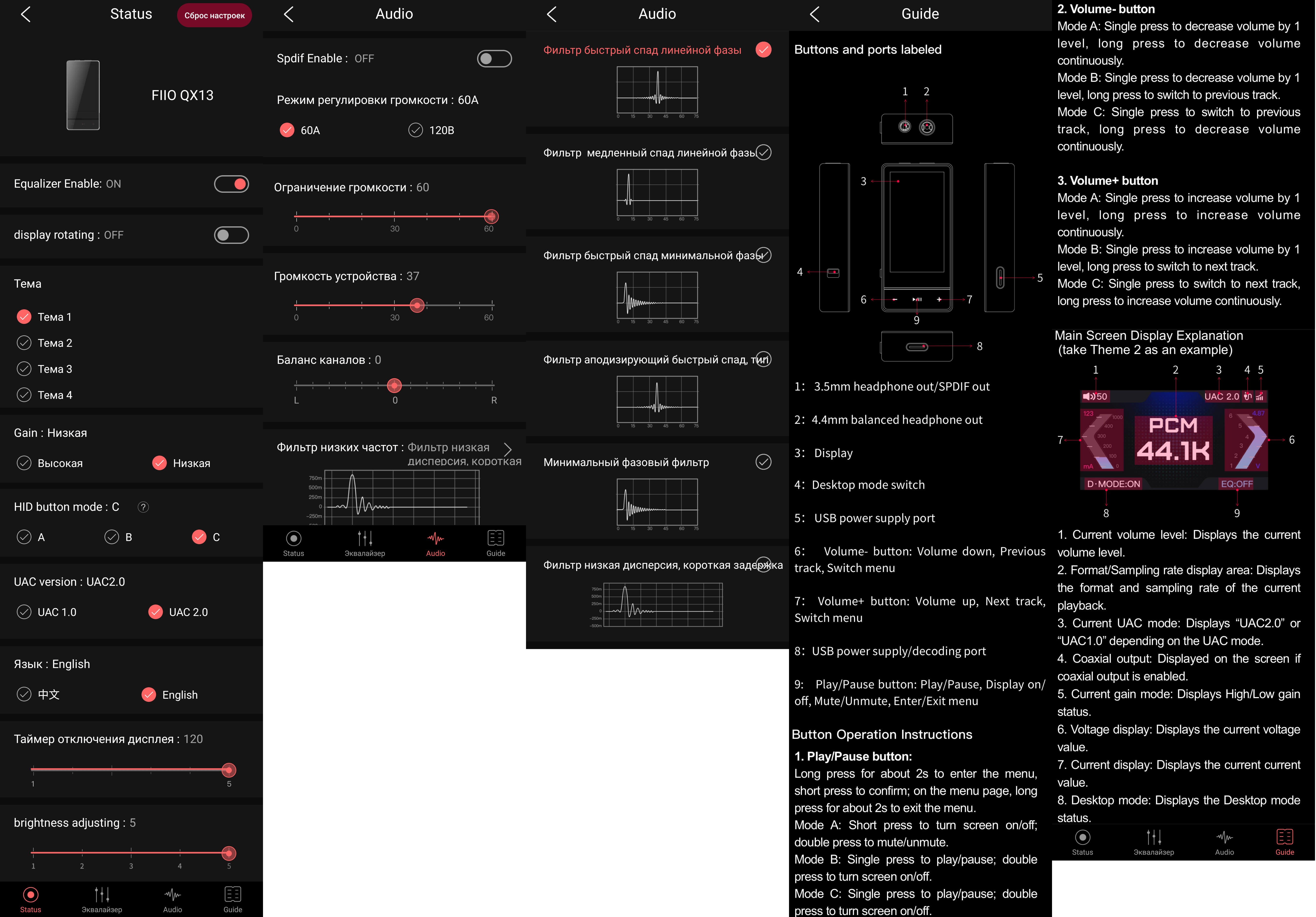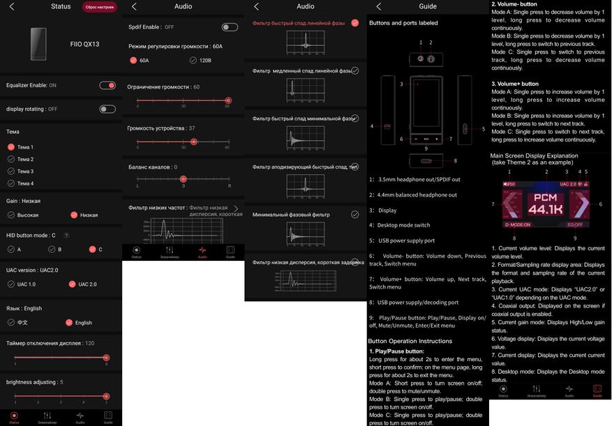 В фирменном приложении FiiO Control можно настроить практически всё то же самое, что и в самом ЦАПе, и плюсом идет инструкция на английском языке. Для добавления нового устройства нужно нажать значок «+» в верхнем правом углу основного окна, выбрать подключенный FiiO QX13 и разрешить к нему доступ приложению. Изначально доступны только три основных вкладки приложения, которые отображаются снизу, но если Equalizer Enable перевести в положение ON, то станет доступна и опция параметрического эквалайзера. Инструкция в приложении приведена более полная, чем приведено на скриншоте.