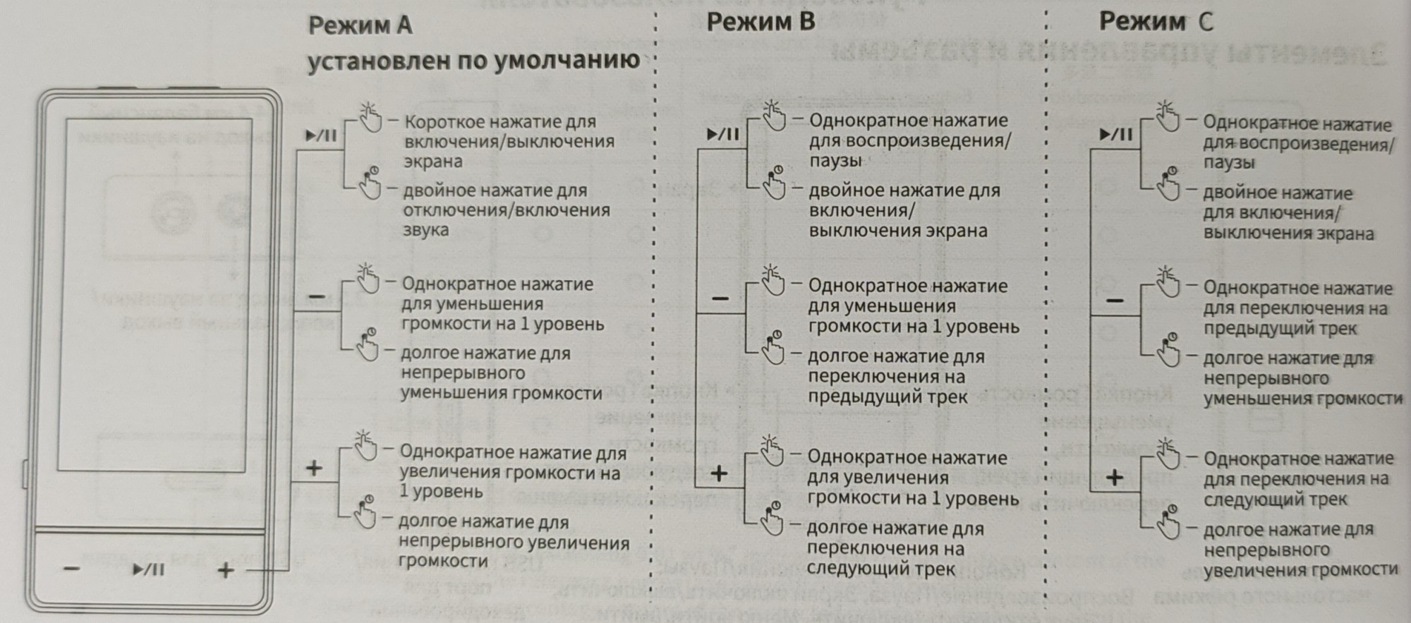 Для управления воспроизведением, громкостью и переключением треков есть три кнопки, которыми также осуществляется вход/выход в меню и подменю и навигация по меню. Есть три варианта управления, которые можно выбрать в меню ЦАПа, и они одинаково работают как для подключения к смартфону, так и для ПК. Стоит только добавить, что громкость всегда меняется встроенная у ЦАПа, а у режима А для двойного нажатия с моими смартфонами на MIUI 12 и 14 срабатывает кратковременное снижение громкости, как это бывает при получении сообщения, а с ПК это работает как play/pause.