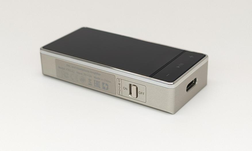 На лицевой панели расположился 2-дюймовый LCD-дисплей с разрешением 170х320 пикселей и три кнопки управления: по центру многофункциональная кнопка, она же play/pause, и по краям кнопки «+» и «-», которые также являются многофункциональными. На задней панели ничего нет, кроме логотипа компании и названия модели. На верхнем торце два выхода на наушники — это стандартный 3,5 мм, который также может быть использован как коаксиальный выход, и сбалансированный на 4,4 мм. На нижнем торце — USB Type-C разъем для питания и передачи данных. На левой боковой грани — переключатель Desktop Mode, на правой — USB Type-C порт для дополнительного питания от Power Bank. Насчет использования с QX13 любого пауэрбанка я не уверен, но…