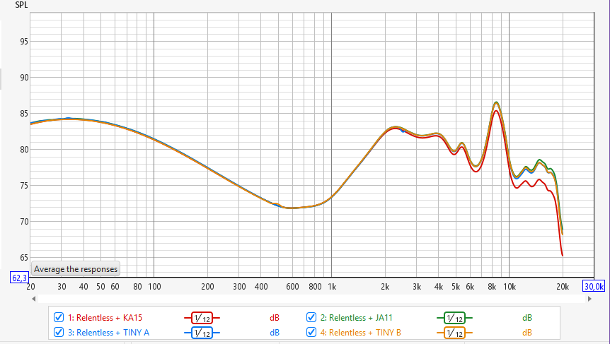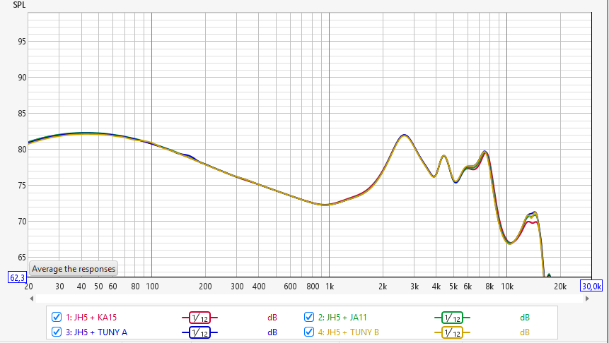 Но такие изменения в АЧХ в зависимости от источника показывают в моей практики только Relentless. И если взять, например, другие гибридные наушники — FiiO JH5 1DD+4BA (13 Ω, 105 dB), то различия в АЧХ незначительны. И такие же результаты будут практически с любыми гибридами. А с соло динамическими и планарными АЧХ вообще обычно показывает полное совпадение у различных ЦАПов и даже в сравнении со смартфоном. Это просто Relentless такие «странные».