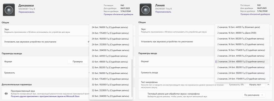Заявлена поддержка дискретизации до 384 кГц и 36 бит, и всё это есть для воспроизведения, а для записи доступны 176,4 кГц и 24 бит. Если TINY A звучит громче, то звук он пишет заметно тише, чем TINY B при 100% громкости ввода для обоих ЦАПов с одним и тем же гарнитурным кабелем. Кнопки управления трехкнопочного гарнитурного кабеля работают как полагается и с Android, и с Windows — плей/пауза, переключение треков центральной кнопкой и изменение системной громкости кнопками громкости.