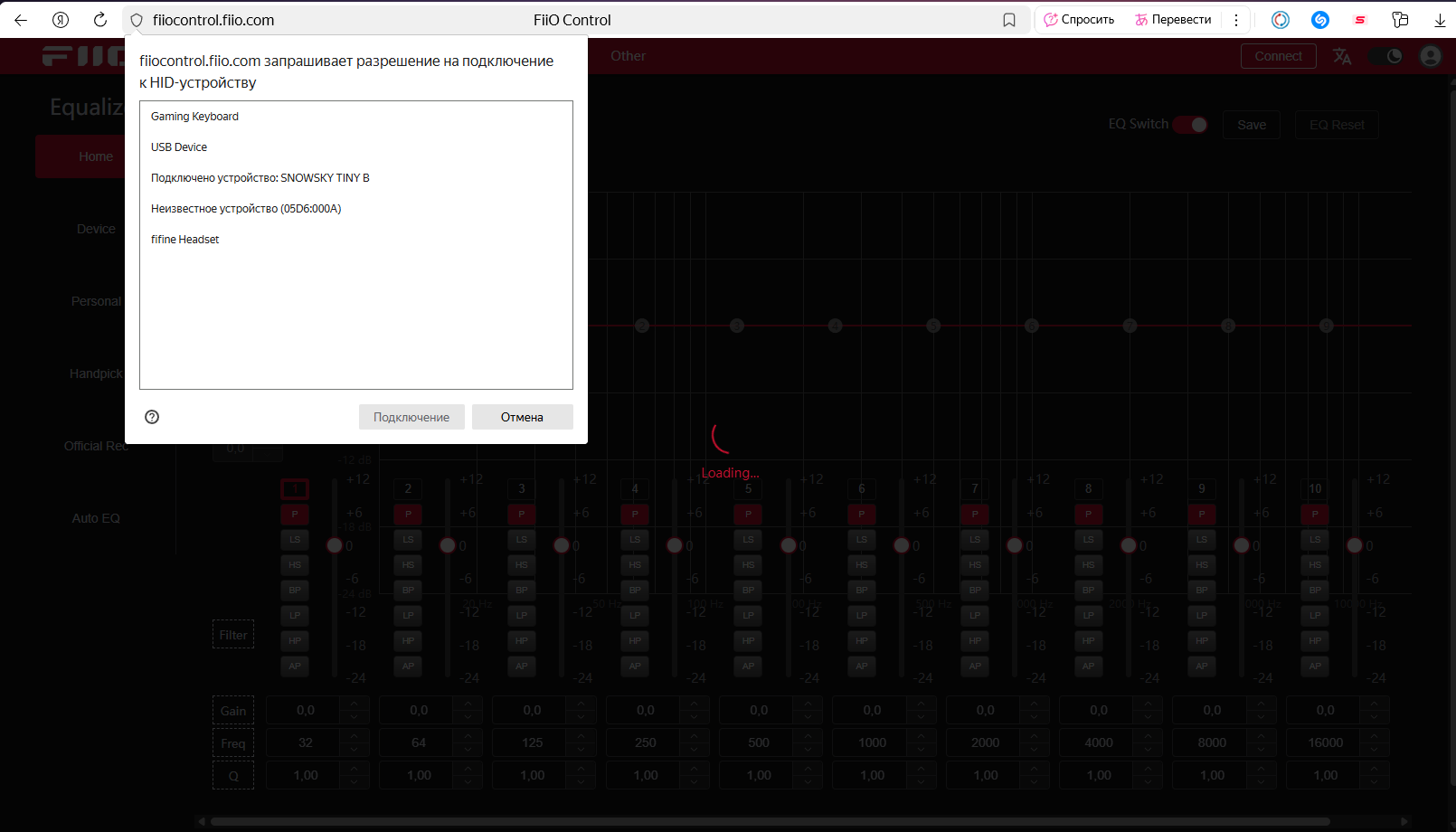 Для настройки EQ можно также воспользоваться и WEB-версией FiiO Control. На странице WEB-версии FiiO Control для начала стоит выбрать английский язык кнопкой в левом верхнем углу, затем через кнопку «Connect», расположенную рядом, подключаемся к вашему TINY, сначала подтвердив выбор подключения в появившемся окне. Для редактирования эквалайзера нужно будет через кнопку «Device» выбрать нужный пользовательский пресет. Сам эквалайзер здесь такой же, только влияние здесь обозначено аббревиатурами.
