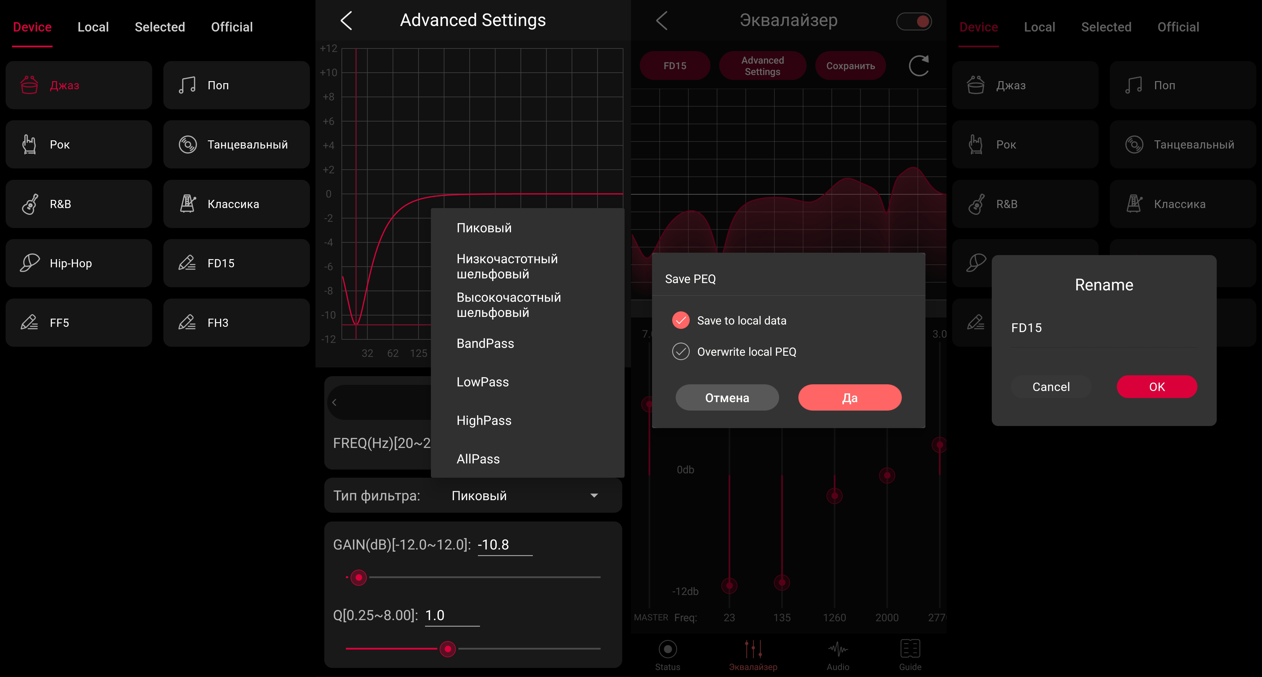 Во вкладке настройки EQ задаем усиление/ослабление GAIN полосы, и, помимо того, что можно установить нужную собственную частоту полосы FREQ, можно выбрать инструмент влияние на звук. Самыми ходовыми инструментами влияния для обычной эквализации будут «Пиковый», «Низкочастотный шельфовый» и «Высокочастотный шельфовый». Для специфических задач, возможно, пригодятся и остальные. После выбора влияния или использования «Пикового», который по умолчанию, можно также настроить ему и ширину полосы параметром Q, который для шельфов работает как крутизна спада. Все изменения сохраняться в пользовательский пресет автоматически, но можно также сохранить настройку и в приложении FiiO Control, чтобы затем внести ее, например, в другой пользовательский слот.