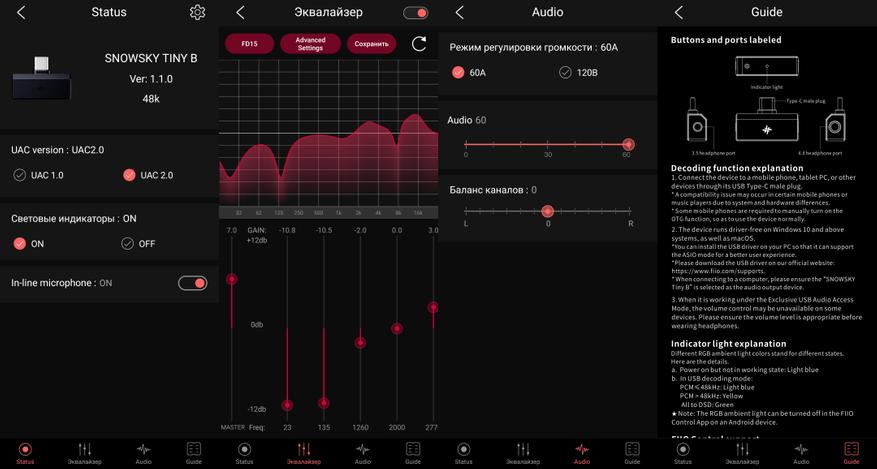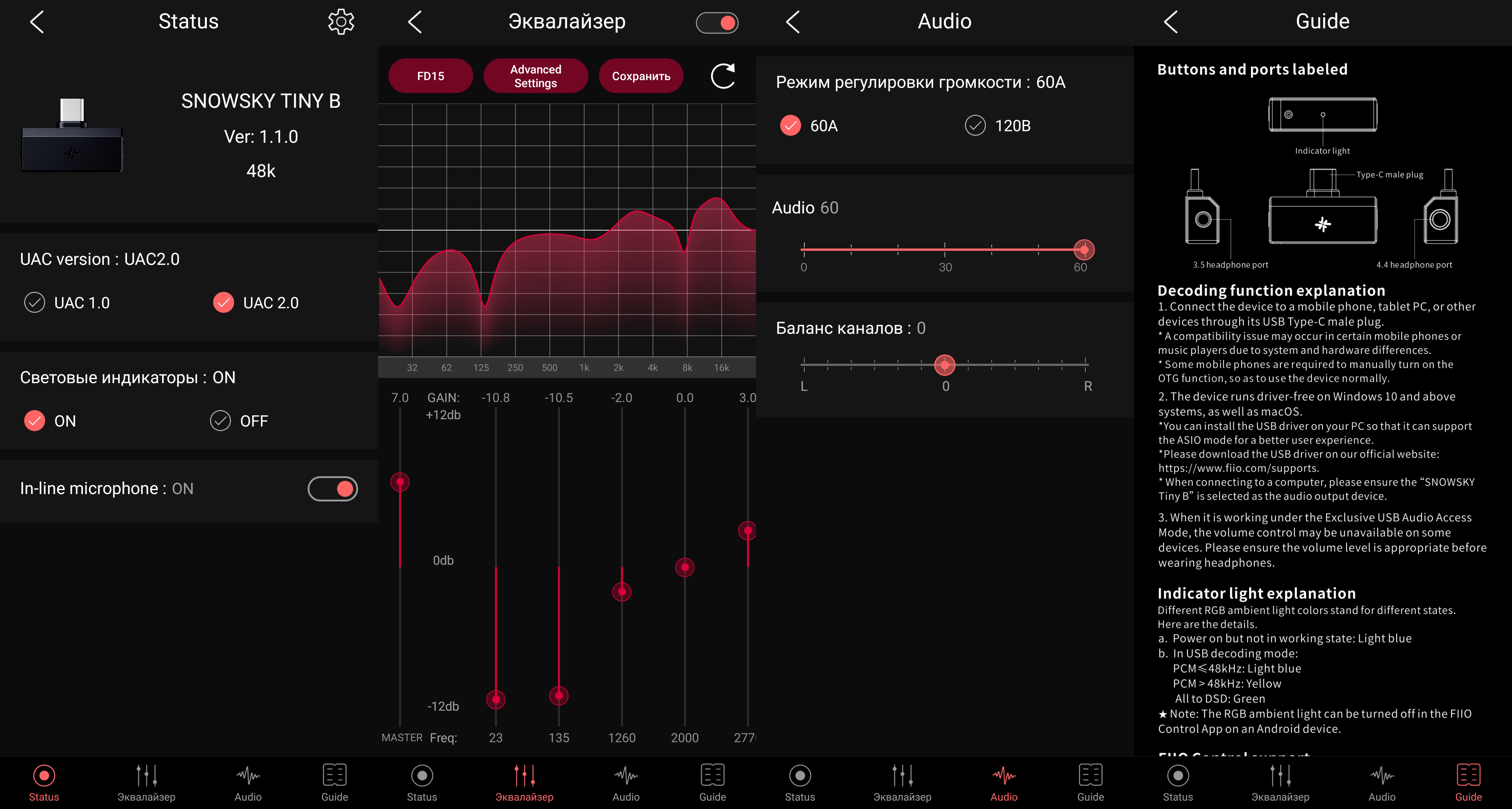 В приложении FiiO Control всё одинаково для обоих ЦАПов, кроме краткой инструкции, которая на последней вкладке, и у каждого ЦАПа она своя. Кроме того, что у ЦАПов можно выбрать версию UAC, отключить светодиод и поддержку микрофона, настроить громкость с балансом, можно также выбрать количество шагов для громкости, и я не понял, на что это влияет.