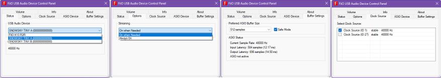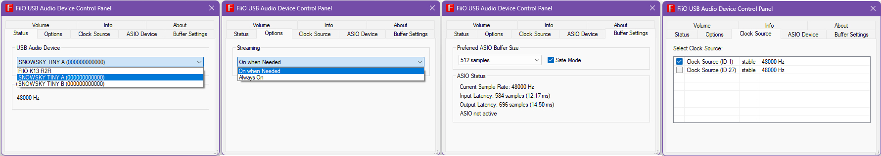 При подключении к ПК с Windows 11 Pro никаких дополнительных драйверов скачивать не нужно, но можно скачать фирменные ASIO-драйвера. В трее появится иконка приложения с некоторыми настройками для ЦАПа. Там же можно будет выбрать активный ЦАП для ASIO, если у вас несколько ЦАПов FiiO.