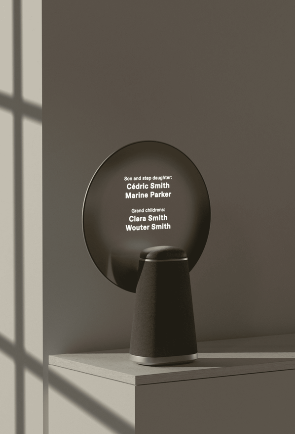 Основное устройство оснащено гибким дисплеем, динамиками, механизмом наклона и батареей. Аппарат подключается к защищенной цифровой платформе, где родственники и опекуны загружают фотографии, записанные истории, голоса близких и контекстную информацию об окружении пациента. Механизм наклона адаптирует положение экрана в зависимости от позы пользователя. Гибкий дисплей настраивается под разные условия освещения в течение дня.