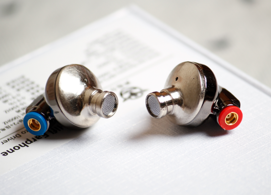 Корпуса увесистые (вес одного наушника: 6 грамм). Возле MMCX есть цветовое обозначение в виде кружочков (красный-правый, синий-левый). Диаметр звуковода около 6 миллиметров, подходят практически любые сторонние насадки.