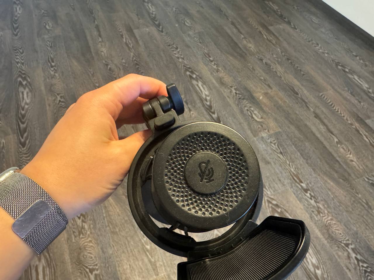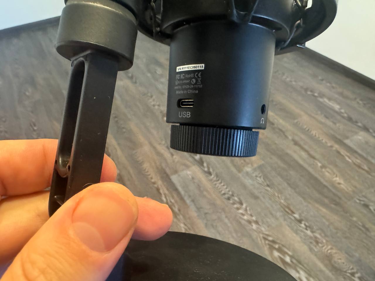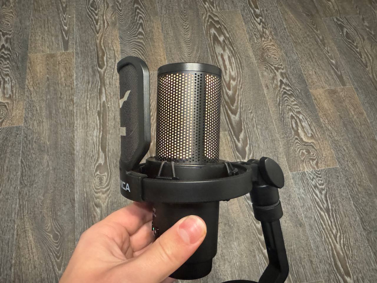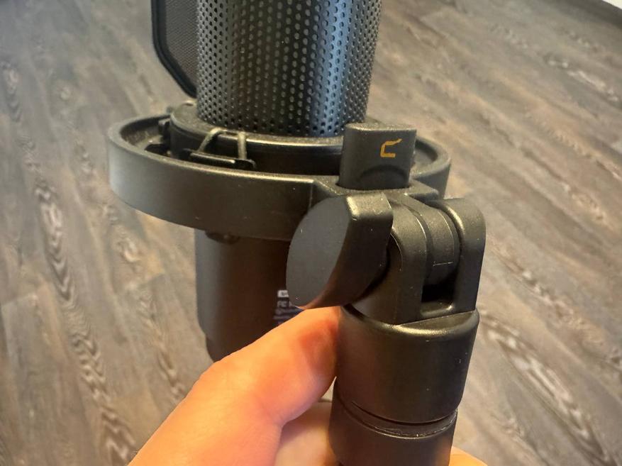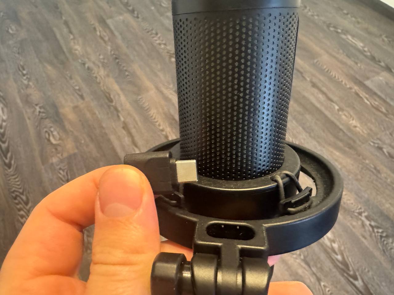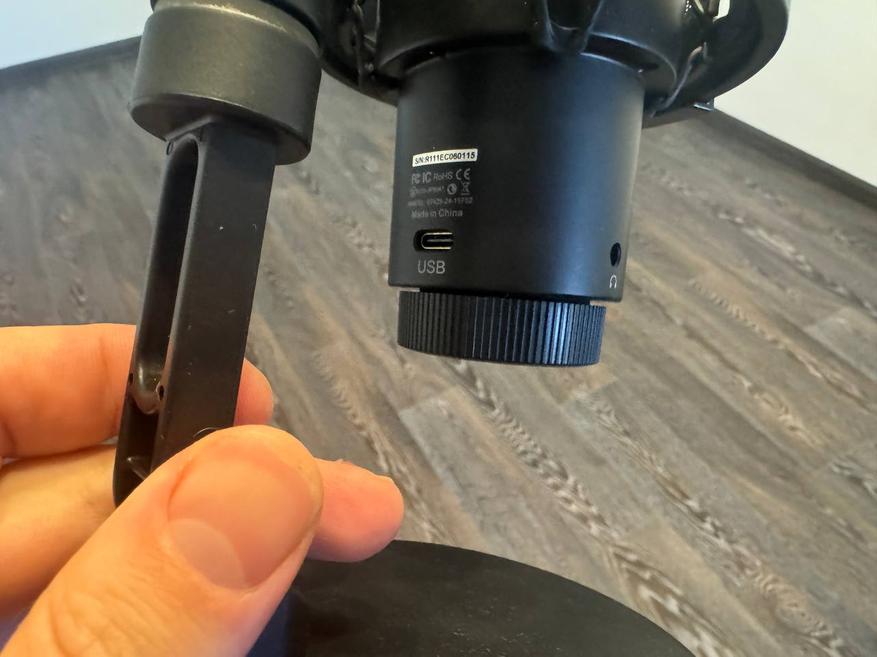 Подставка тяжёлая и устойчивая, нижняя часть имеет мягкую накладку, чтобы не царапать стол. Конструкция позволяет накручивать и снимать микрофон при необходимости. Сзади есть отверстие для кабель-менеджмента, а также разъём USB-C. Сбоку AUX для подключения наушников, что позволяет сразу мониторить звук.