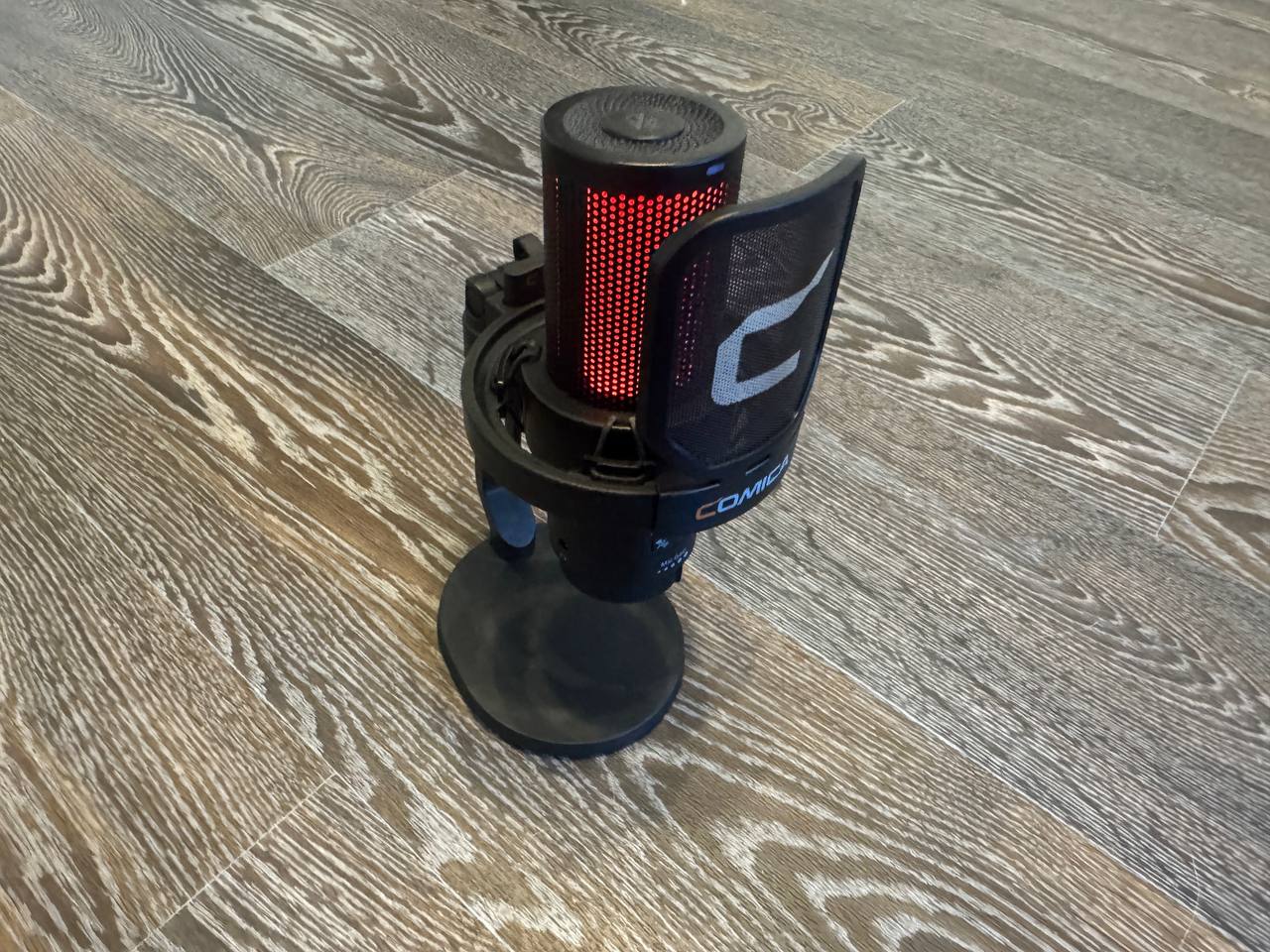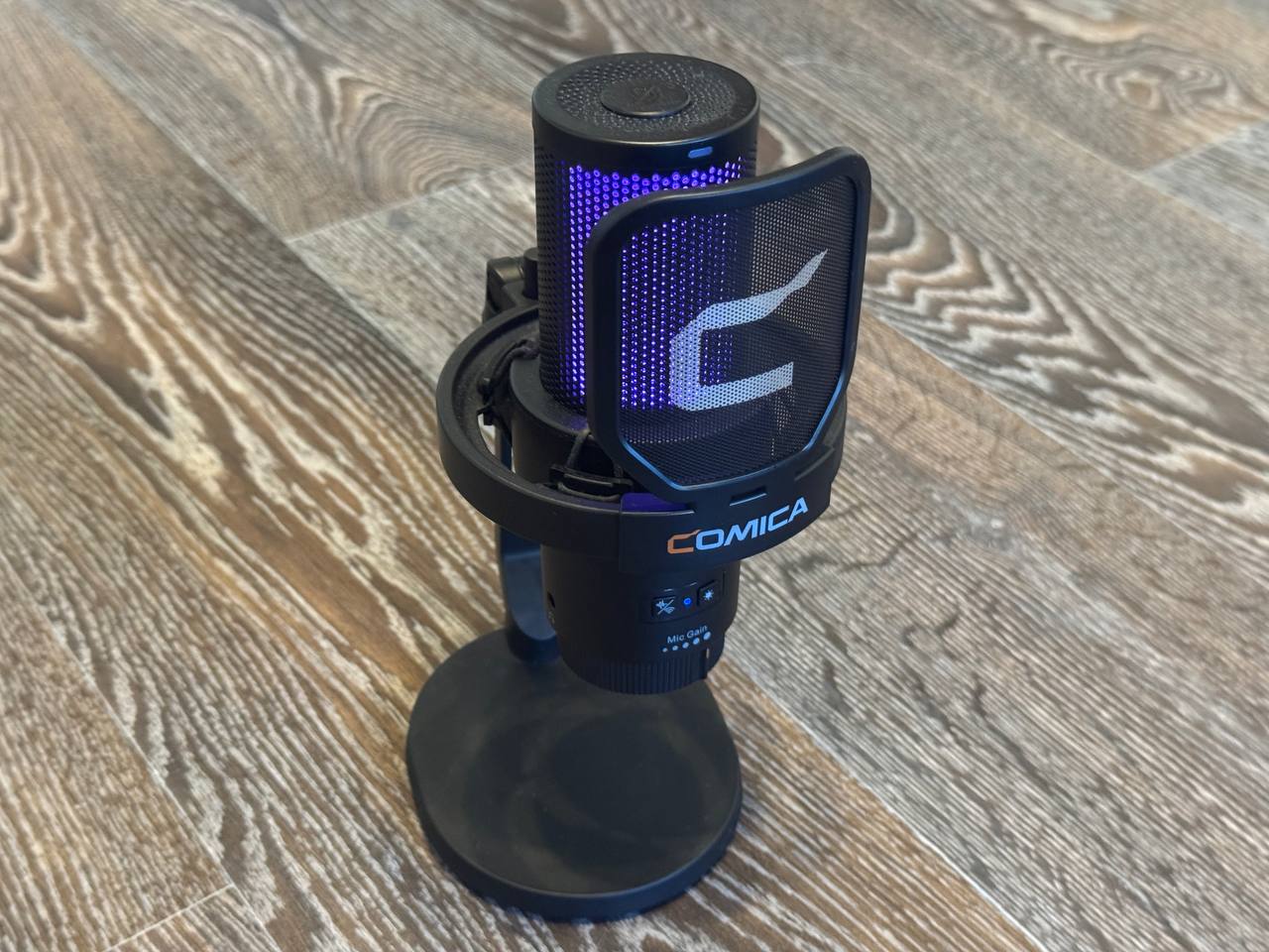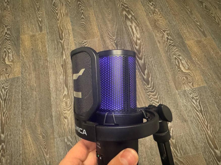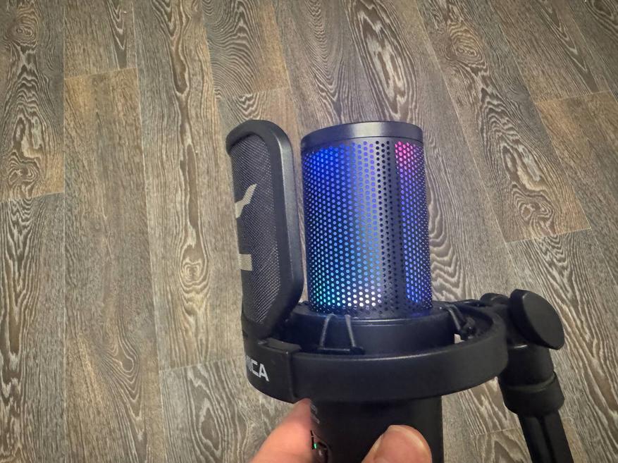 На столе микрофон смотрится достойно, даже если он стоит рядом с ноутбуком премиум-класса и игровой ПК-сборкой. Радует RGB подсветка, которая имеет 4 режима работы (желтый цвет, переливание однотонных цветов, переливание градиентов цветов и реагирование пульсацией на издаваемый звук). Сверху сенсорная панель, которая отвечает за включение записи звука и «мьют». Снизу кнопка активации устройства, которую нудно зажать и держать около 5 секунд, как для включения, так и для выключения, что мне показалось не очень удобным. Рядом кнопка для управления режимами подсветки. Пластик у микрофона, конечно, недорогой, это чувствуется, но внешний вид при этом не страдает (в том числе благодаря наличию подсветки).