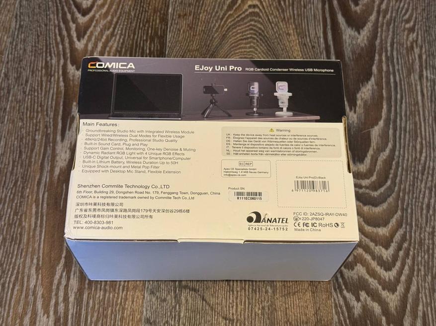 Коробка у Comica Enjoy UniPro максимально простая, но имеет красочную полиграфию. При этом картон самый обыкновенный, больше напоминающий бюджетный китайский вариант, чем что-то дорогое. На главной изображение самого устройства и типы его подключения. Сзади изображения микрофона в разных цветах: черном и белом, а также спецификации на английском и китайском языках.