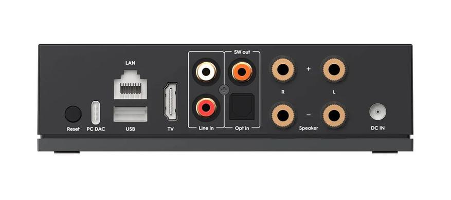 Интерфейсы: линейный вход (RCA), оптический (192 кГц/24 бит), HDMI, выход на сабвуфер, USB-A хост для носителей с музыкальными файлами (до 128 ГБ), USB-C для подключения к ПК (частота дискретизации 48 кГц) и RJ45 для проводного подключения к роутеру.