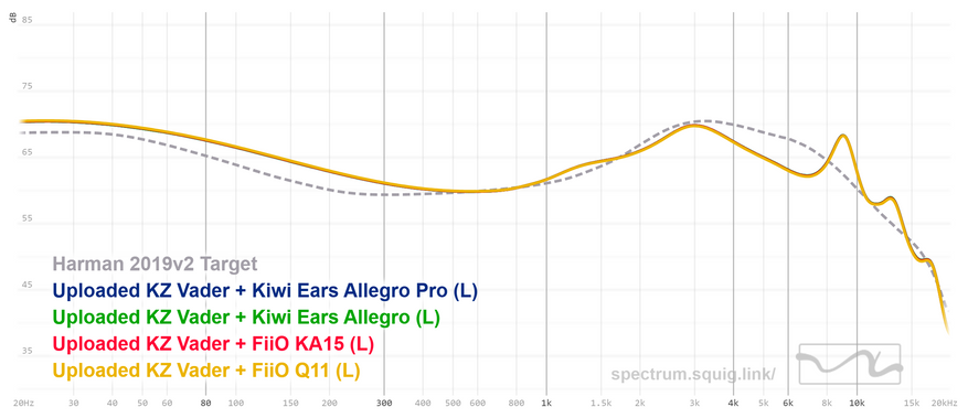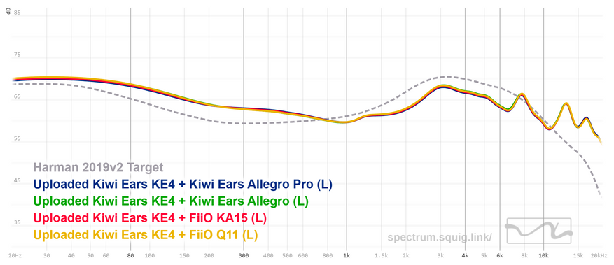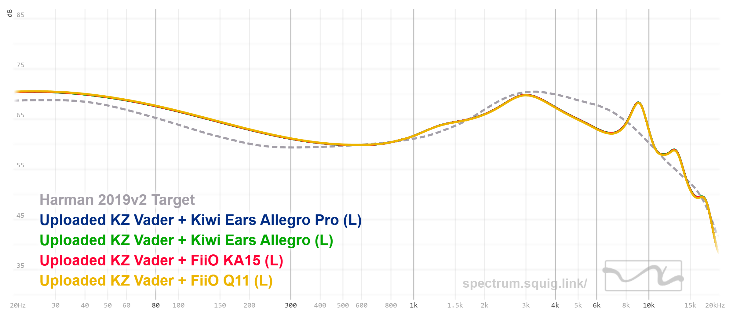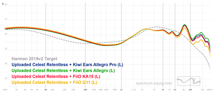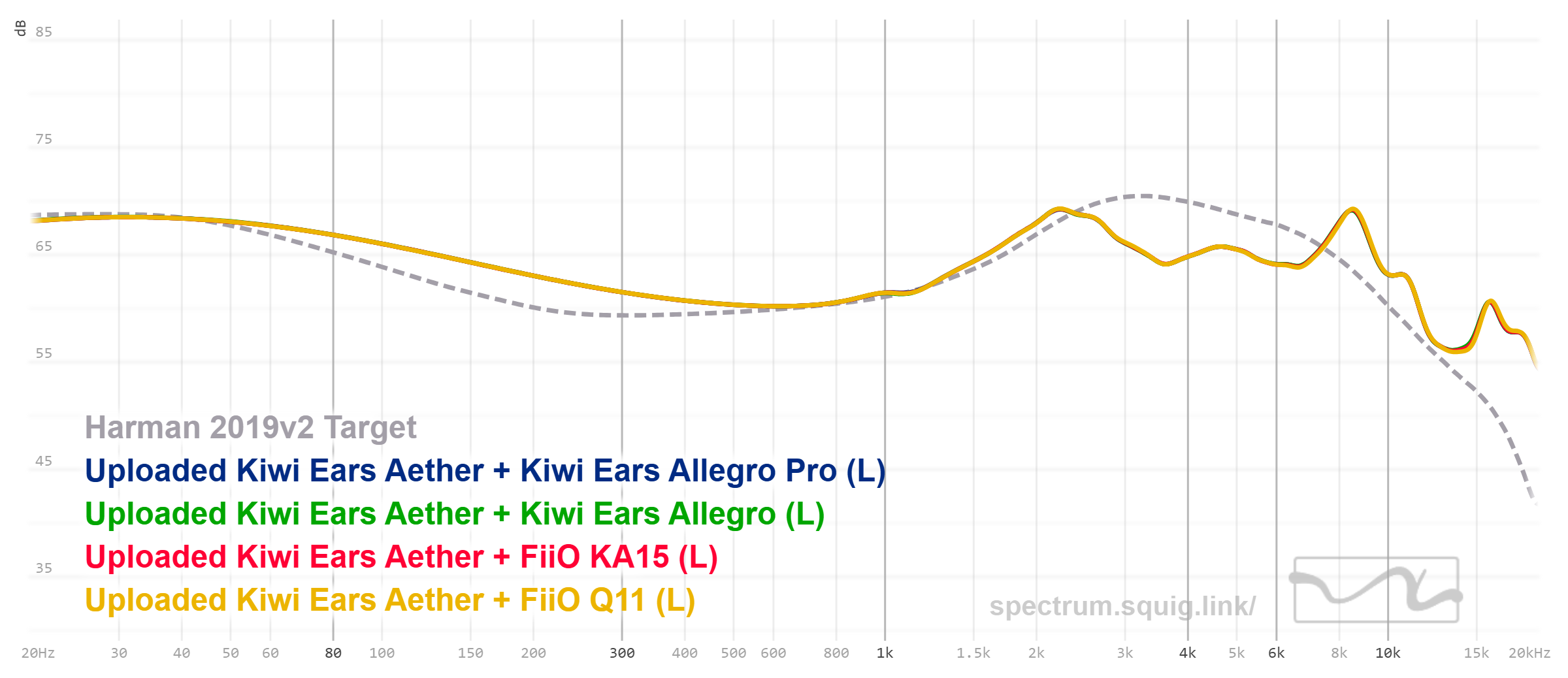 Вопросов к звучанию Allegro Pro у меня нет, тональный баланс, детализация, разделение, позиционирование и сцена — всё на своих местах. Для того чтобы наглядно было видно, как звучит данный ЦАП и какое влияние оказывает на тональный баланс, я взял несколько пар IEMs и сделал замеры для одного канала, сравнив Allegro Pro с другими ЦАПами.