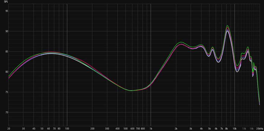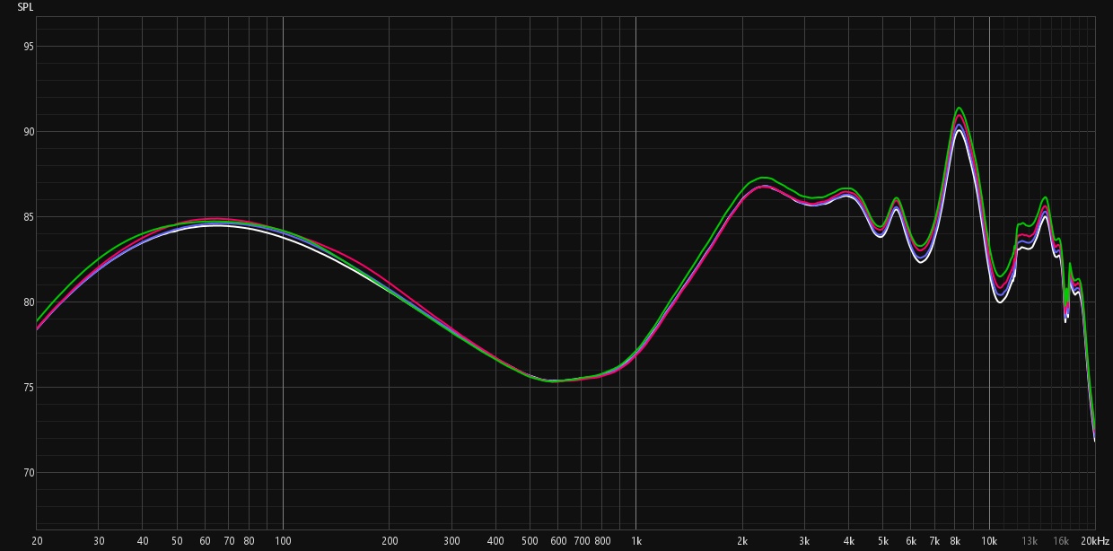 Kiwi Ears добавили в Allegro Pro три «оптимизированных режима звука»: «Игра», «Фильм» и «Музыка». Точных объяснений нет по этому поводу, то ли это настройки эквалайзера, то ли что-то еще, но по факту на слух это, можно сказать, не проявляется. При переключении режимов изменения в звучании происходят, но на уровне «показалось». Я сделал замеры всех четырех режимов и специально сильно увеличил вертикальный масштаб. Белый график соответствует нейтральному значению с выключенным светодиодом, остальные — цвету светодиода. Вы можете убедиться, что замеры показывают изменения тонального баланса в пределах чуть больше 1 дБ на высоких и низких частотах.
