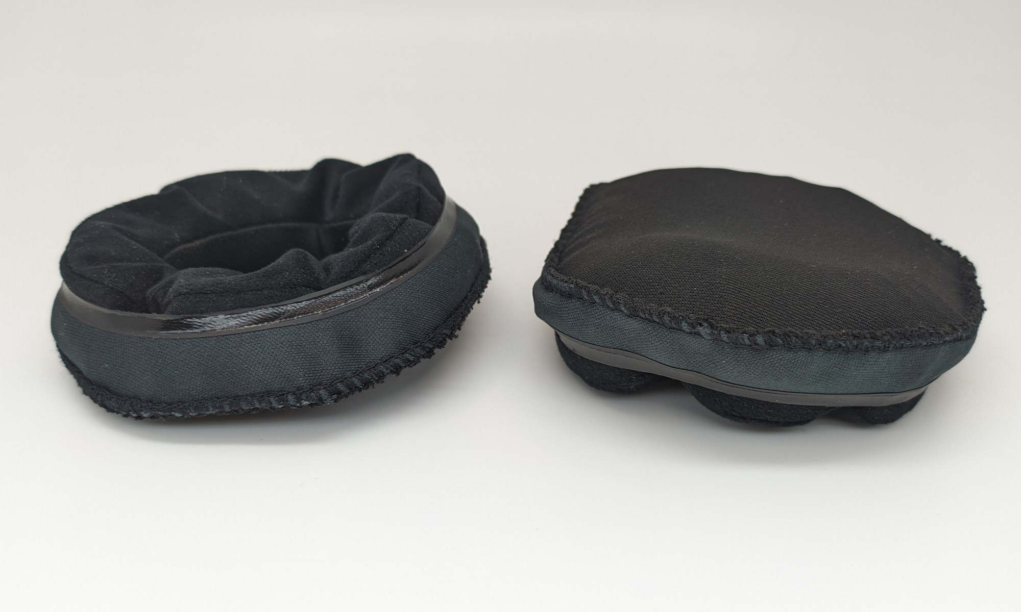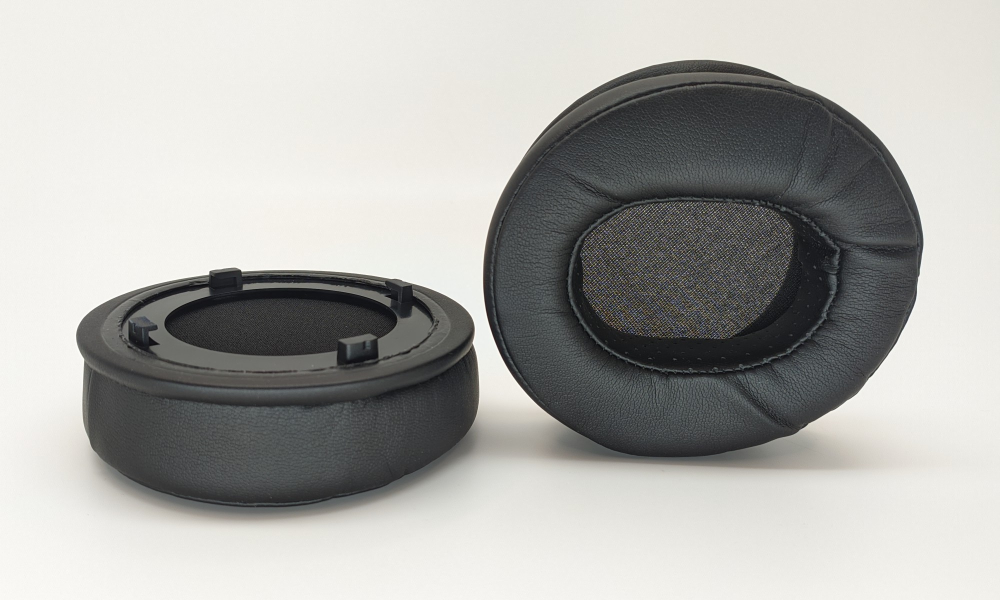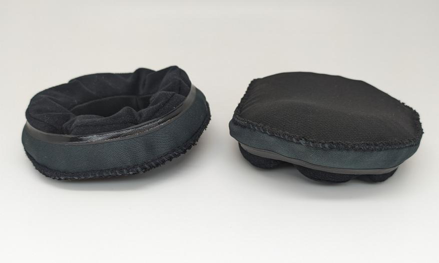 Комплектные амбушюры немного отличаются. Диаметр у них одинаковый — 100 мм, а вот толщина и выемка под ухо немного отличаются. Так, амбушюры из экокожи толщиной 28 мм с овальной выемкой размерами 65 на 45 мм. Велюровые толщиной 25 мм с выемкой размерами 60 на 45 мм. Их также хватает для среднего уха вполне.