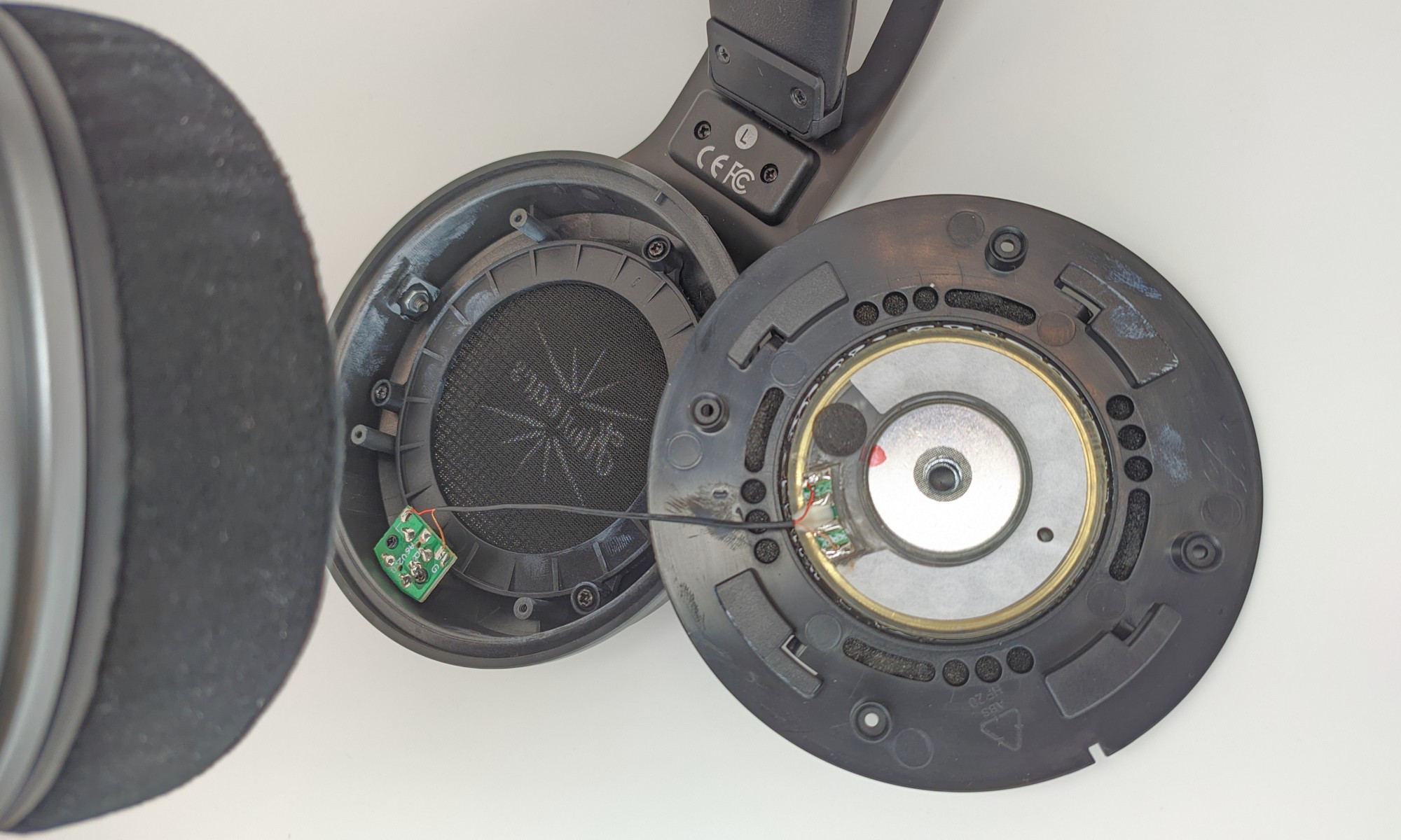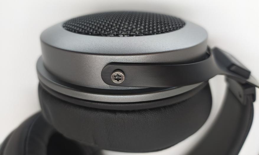 Оголовье из кожзама. Оно подстраивается под размер головы за счет подпружиненной конструкции. Оголовье скользит по двум направляющим с каждой стороны, и внутри, скорее всего, они крепятся к резинке. Если что, при желании оголовье можно разобрать, если возникнет необходимость заменить резинку или материал самого оголовья. Также можно разобрать и сами наушники. Конструкцией у них предусмотрено быстросъемное крепление для амбушюр Также можно открутить панель с драйвером и при желании демпфировать чаши или полностью их закрыть, сделав из Altruva полуоткрытые или закрытые наушники. Правда, для последнего варианта придется убрать ткань с логотипом компании. Но это для совсем энтузиастов, но все же хорошо, когда есть возможность для экспериментов. За звук отвечает 50 мм динамический драйвер с диафрагмой из «PU and PEK».