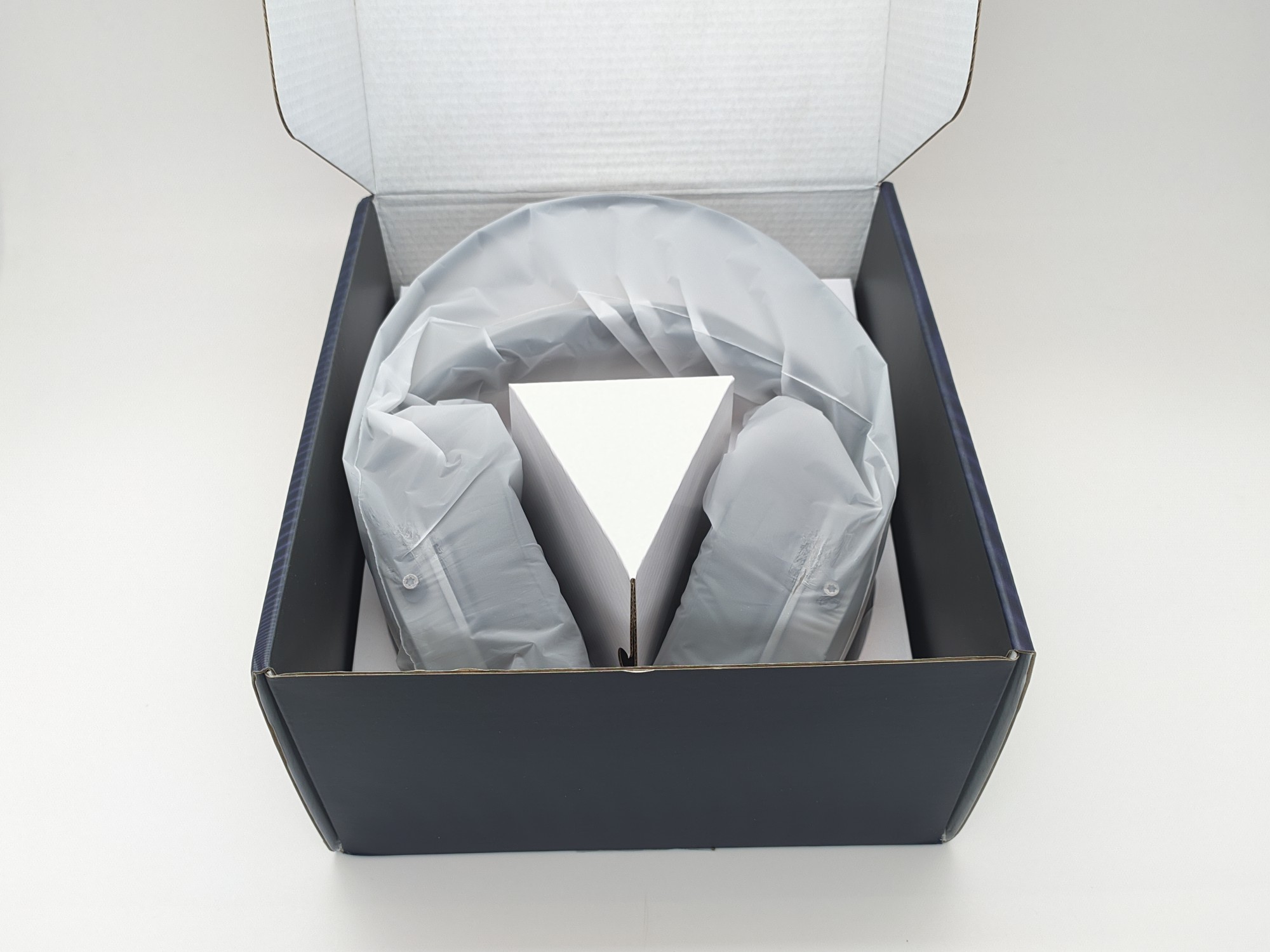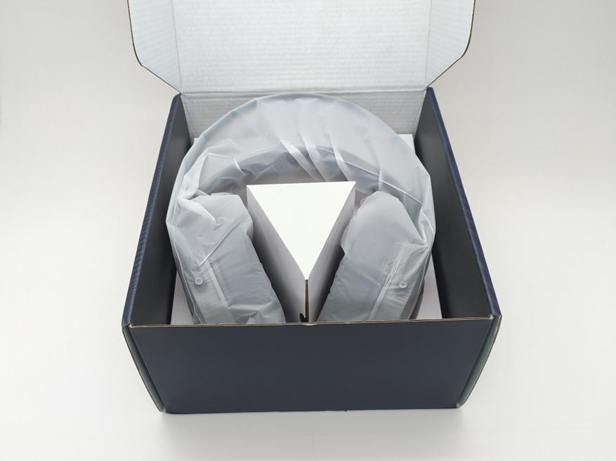 Приходят в крупной коробке из не очень твердого картона. Стенки получились двойными, поэтому жесткости все равно хватает, чтобы коробка не помялась при транспортировке. Внутри наушники фиксируются картонными проставками, и на них надет пакет из мягкого полиэтилена.