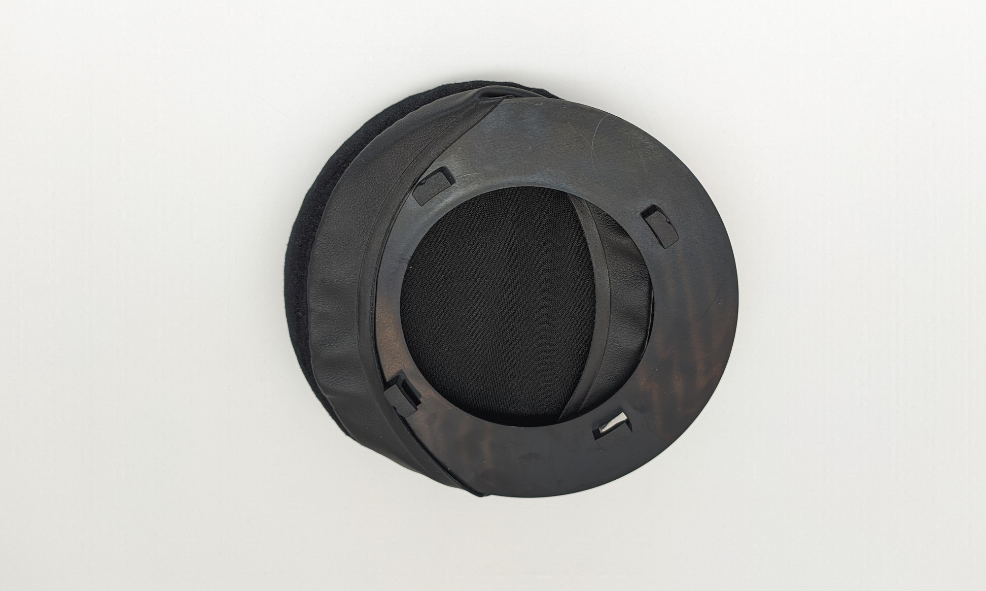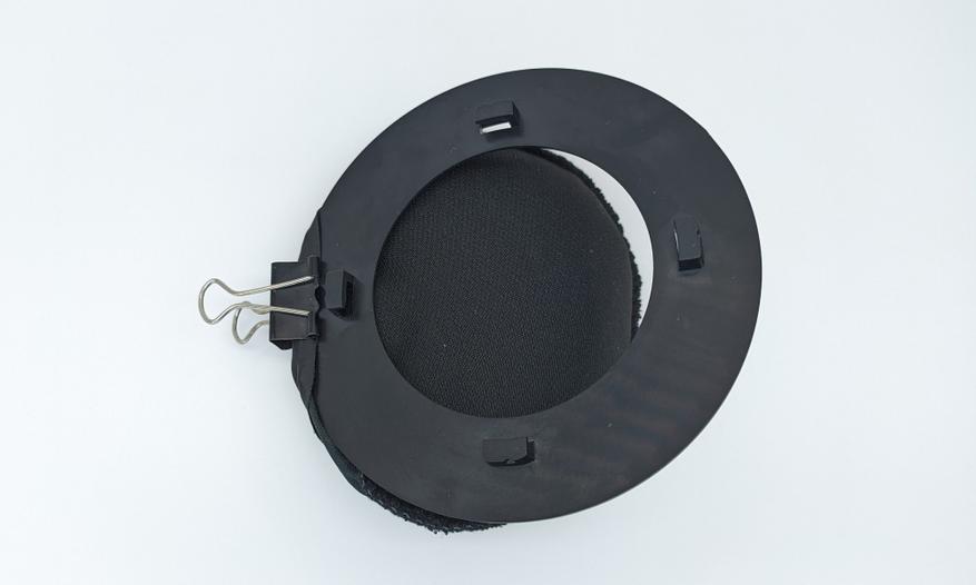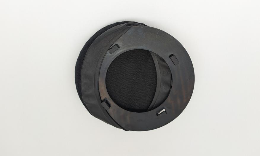 Система быстрой замены амбюшур — это, конечно, хорошо, но надеть еще не растянутые под кольца велюровые амбушюры — тот еще квест. Если кольца с амбушюрами снимаются довольно просто, поворотом против часовой стрелки, и с колец амбушюры тоже снимаются легко, то надеть их, вставляя в них кольцо, у меня не получилось. Но и пробовал я недолго, т. к. опасался их порвать. Проще их надеть, если сначала вывернуть наизнанку материал амбушюр для кольца.