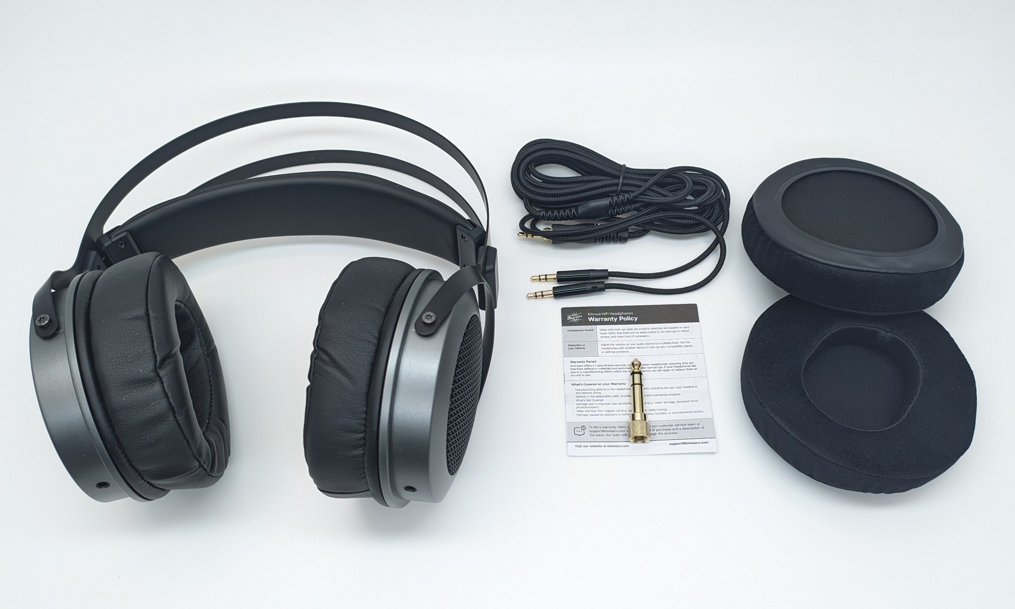 Единый металлический каркас оголовья и крепление для чаш. Пластиковые корпуса чаш с металлической защитной сеткой на внешней стороне. Под сеткой виден логотип компании, нанесенный на тонкую ткань. Конструкция наушников полностью открытая. Это значит, что вместе с вами музыку будут слышать и окружающие. Кабель подключается отдельно к каждой чаше наушников. Из оформления: по бокам на каркасе есть пластиковые вставки с логотипом компании.