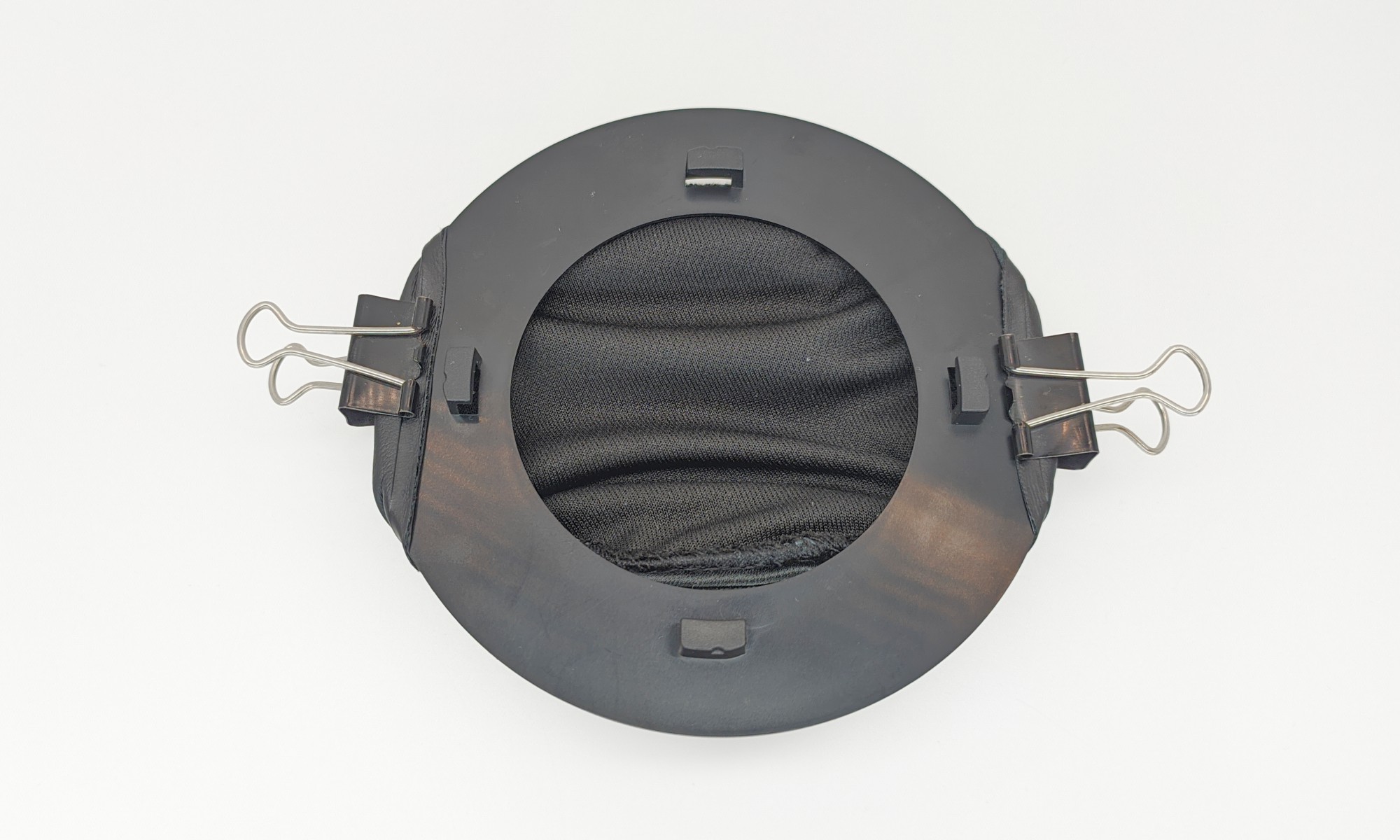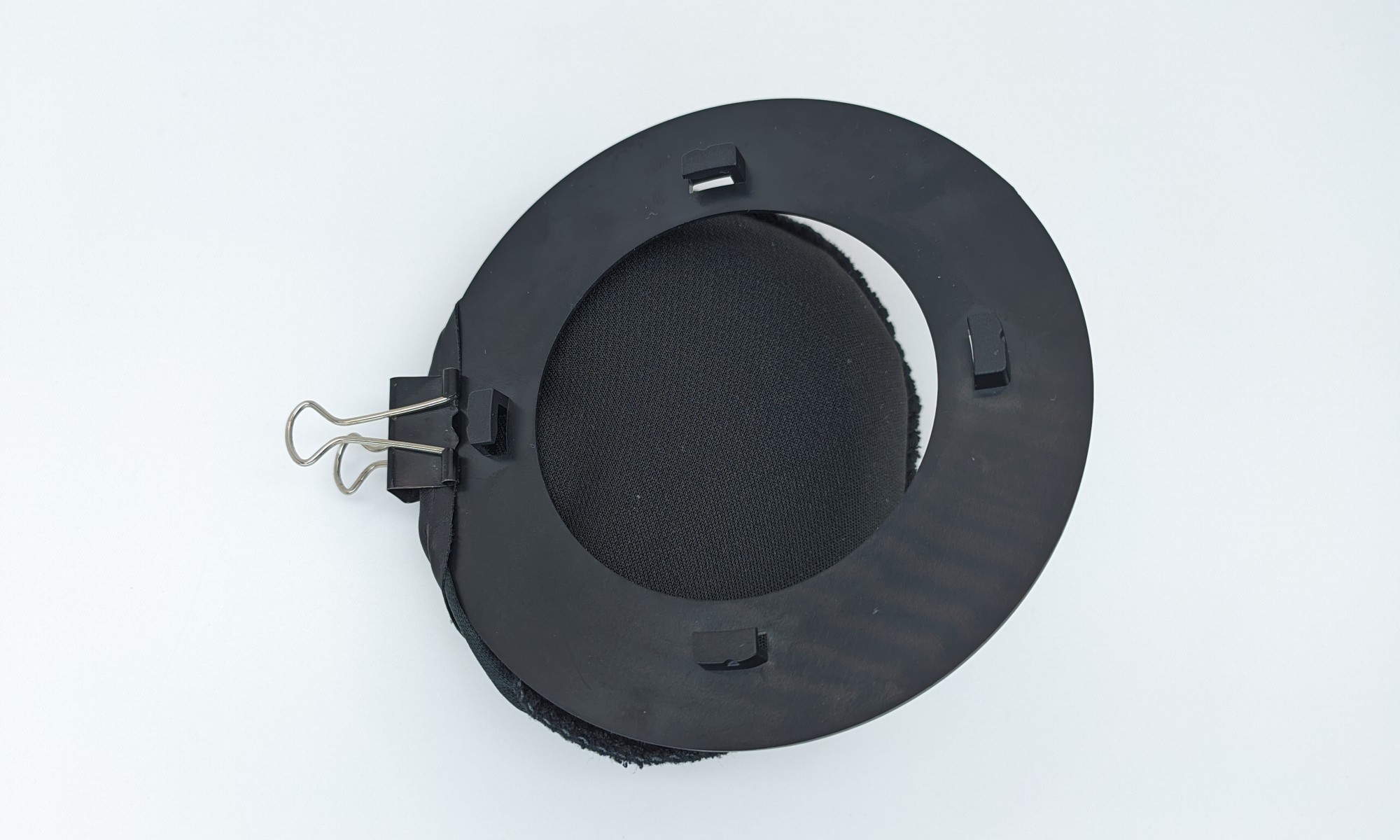 Затем прикладываем кольцо, отворачиваем материал с одной стороны и натягиваем его, фиксируя пальцами либо канцелярской прищепкой так, чтобы заходило всего 5-7 мм. Накидываем также 5-7 мм с противоположной стороны и также фиксируем. И после этого отворачиваем и натягиваем амбушюры по бокам, что делается уже гораздо легче. Чтобы выемки под ухо были расположены правильно, амбушюры можно потом прокручивать на кольцах до нужного положения.