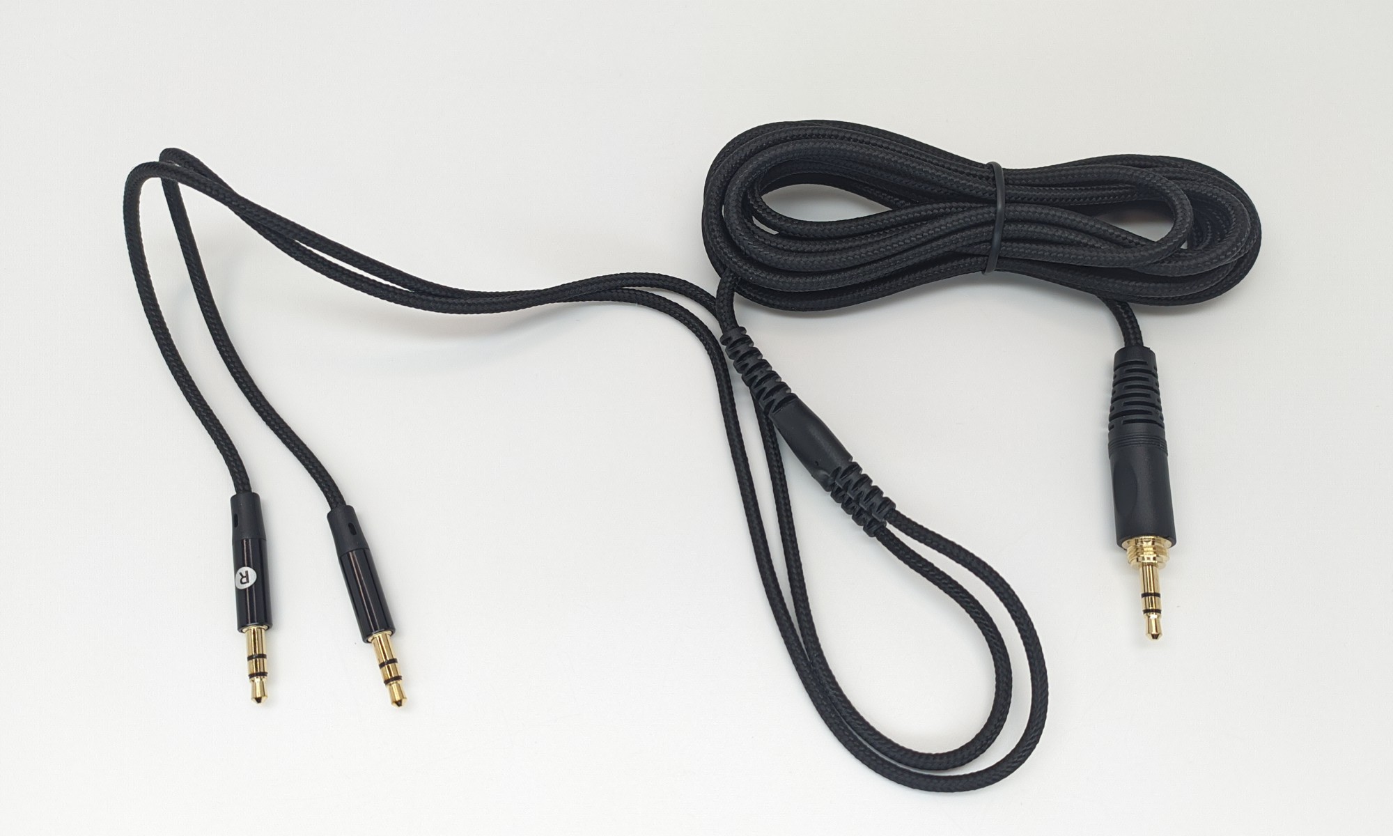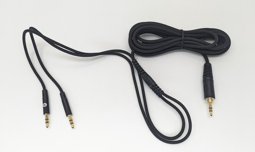 В комплекте, кроме 3-хметрового кабеля, сменных амбушюр и гарантийного талона, есть еще переходник на джек 6,3 мм. Несмотря на тканевую оплетку, кабель немного «упрямый» и запоминает форму, у него упругая, но все же вполне рабочая защита от перегиба на джеках для подключения к наушникам и очень эластичная на корпусе джека 3,5 мм и разделителе. В целом кабель норм, но все же неудобно пользоваться им, сидя за столом. Было бы лучше положить в комплект кабель стандартной длины 1,2-1,5 метра. Все-таки найти удлинитель гораздо проще, чем кабель с двумя джеками на другой стороне.