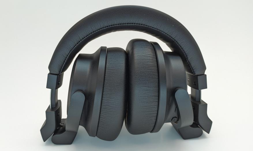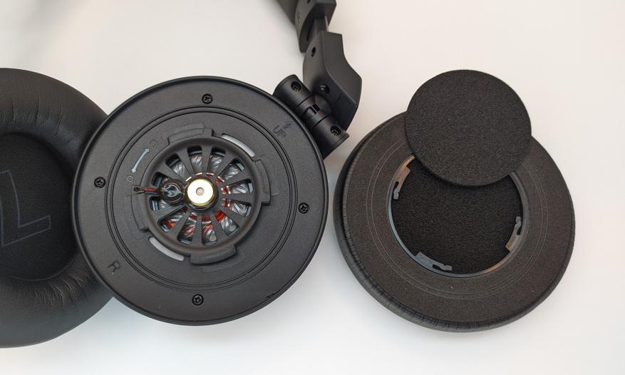 Регулировка размера происходит по 10 шагам и в общей сложности добавляет по 32 мм с каждой стороны. Чаши наушников вращаются вокруг вертикальной оси примерно на 100-105 градусов: 90 градусов в одну сторону и примерно 10-15 градусов в другую, для более комфортной посадки. Вокруг горизонтальной оси чаши вращаются на 180 градусов. Наушники можно сложить на плоскости и в «комок». Амбушюры диаметром 85 мм, а овальная внутренняя выемка под ухо размерами 45 на 53 мм.