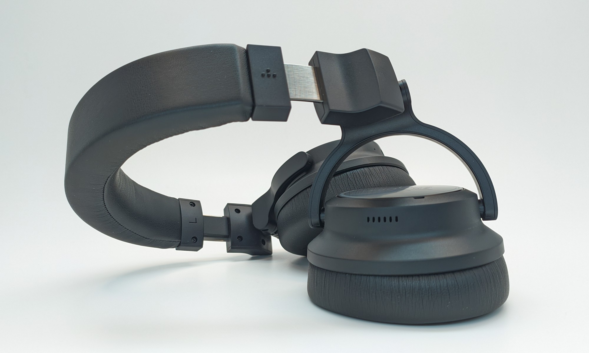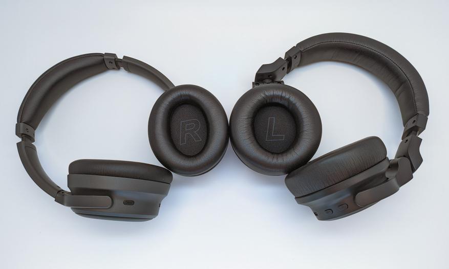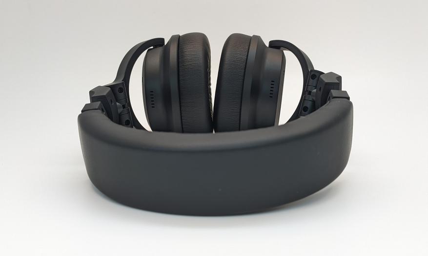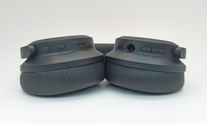 На правой чаше расположились: кнопка включения подсветки; кнопка ANC; светодиод, отображающий активность ANC, и разъем USB Type-C для зарядки наушников. На левой чаше: маленькое отверстие микрофона; отверстие светодиода; аудиоразъем; блок кнопок: кнопка «-», многофункциональная кнопка и кнопка «+». Кнопки немного люфтят. Наверху у каждой чаши расположились отверстия для микрофонов шумоподавления.