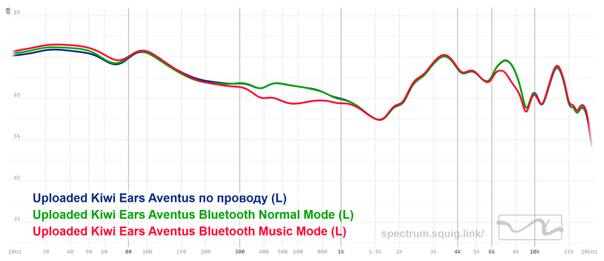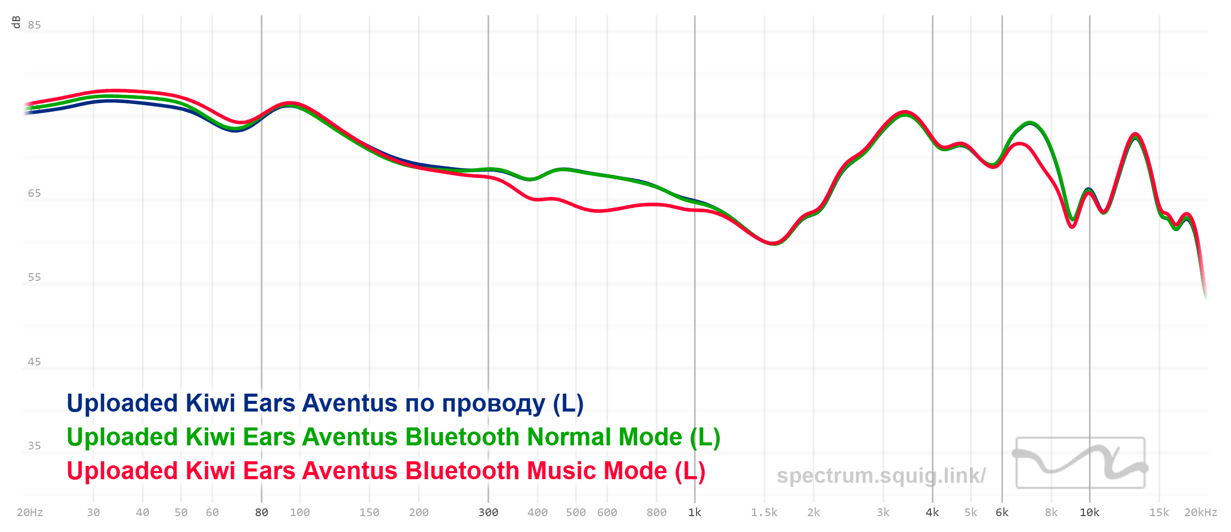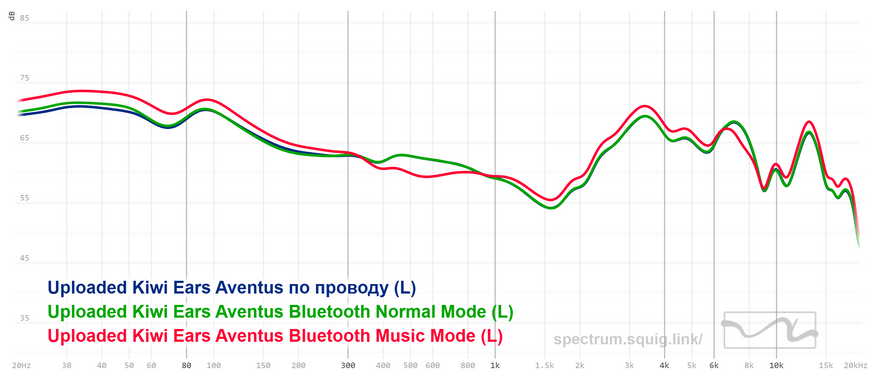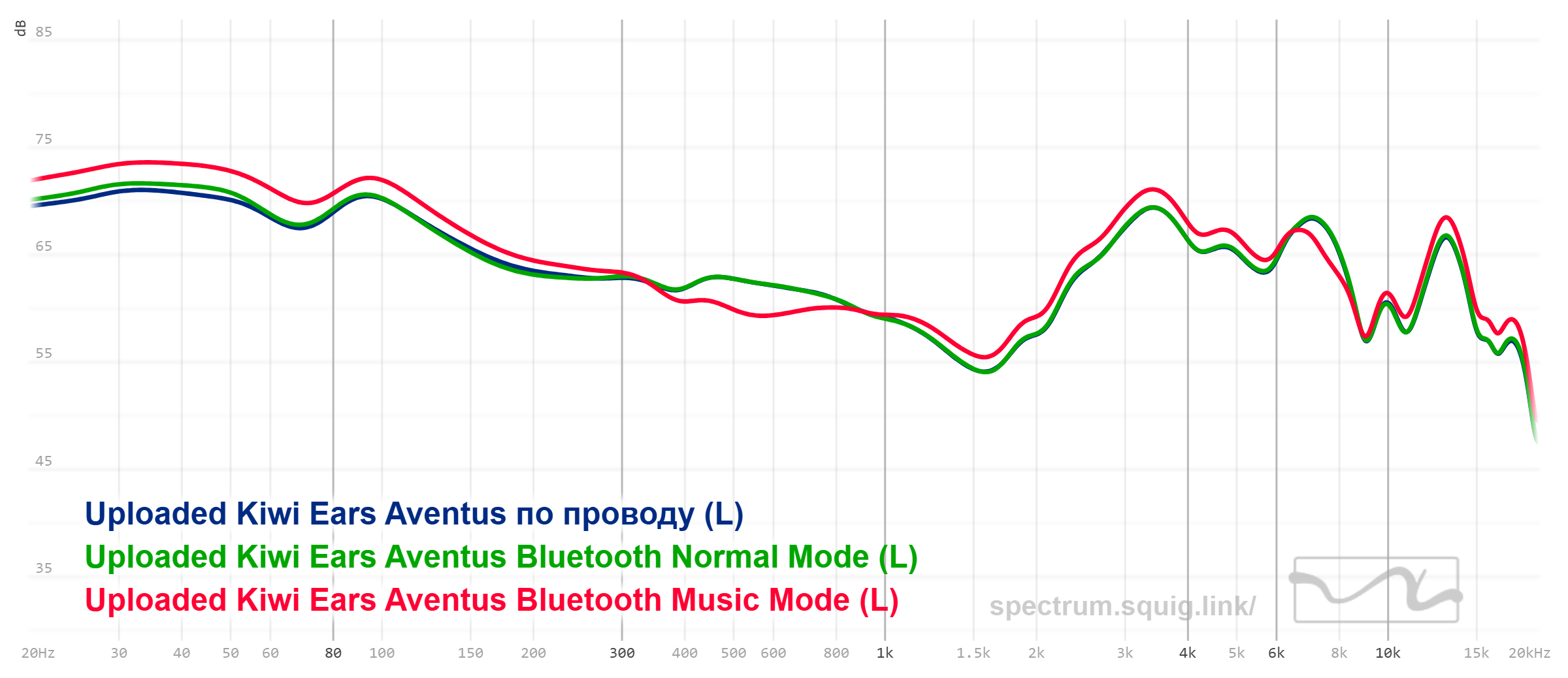 В режиме Bluetooth есть переключение режимов Music Mode и Normal Mode. Режим Normal соответствует звучанию по проводу, а в режиме Music Mode снижаются средние и высокие частоты. На слух разница заметна, но не существенная. Ниже я приведу замер, но снят он не на специальном оборудовании для полноразмерных наушников. То, какой стенд я сделал, чтобы посмотреть разницу этих режимов, это просто колхоз, поэтому не смотрите на кривизну графиков. Мой стенд обеспечил герметичность, но по всем остальным параметрам не думаю, что он подходит, чтобы снять достоверную АЧХ. Но примерную разницу все же можно на нем увидеть. Зеленый и синий практически совпадают, а для красного видны некоторые отличия. На первом изображении я выровнял графики по частоте 1,5 кГц, чтобы разница была нагляднее, а второй без выравнивания. Значит ли это, что изменения вносят звук именно так, а не как это отражает первый график, не знаю, но не исключено.
