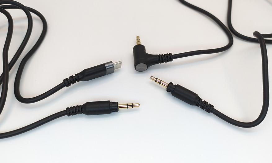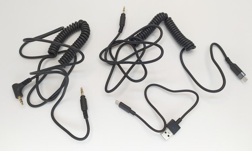 - USB Type-C — AUX 3,5 мм кабель с витой частью провода, длиной 130 см в обычном состоянии и 200 см в растянутом. Есть эластичная защита от перегибов на разъемах. Как уже говорил выше, в этом кабеле есть встроенный ЦАП, который поддерживает разрешение 16 бит и частоту 48 кГц.