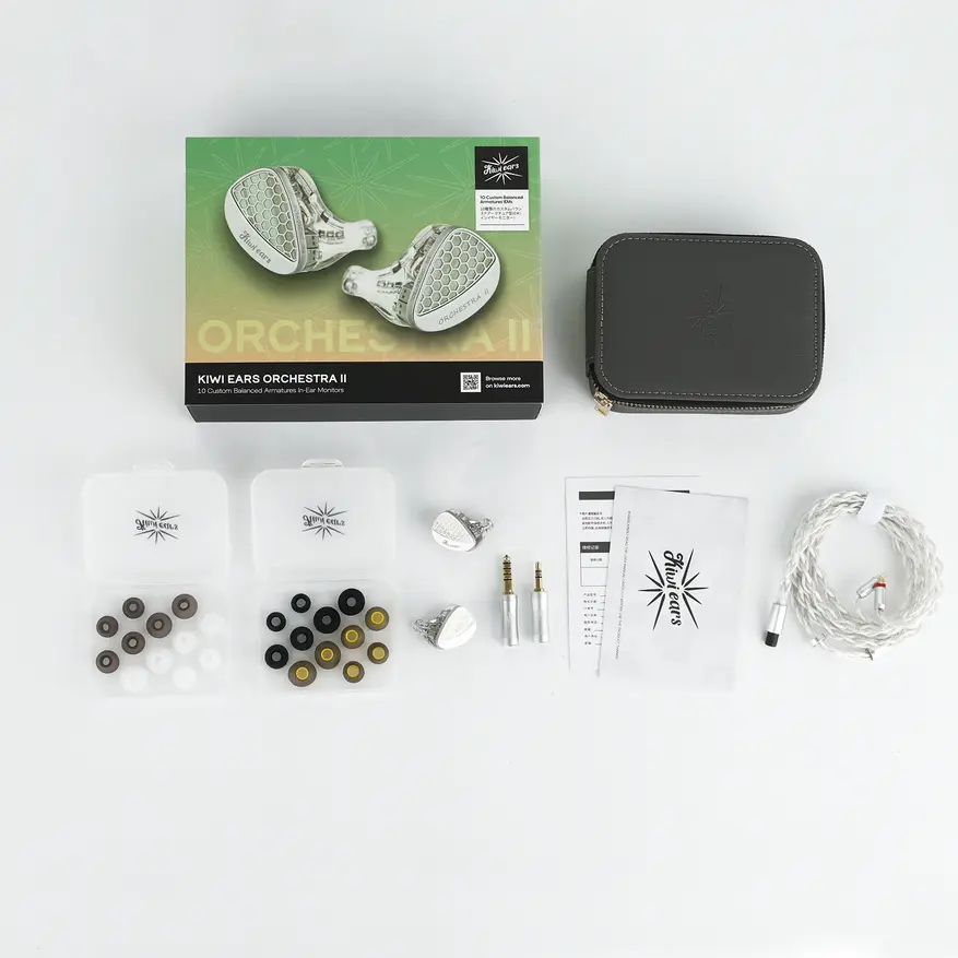 В комплекте поставки входят: 2-pin модульный кабель из посеребрённой монокристаллической меди длиной 1,2 м, разъёмы 3,5 и 4,4 мм и дополнительно включены 12 пар силиконовых амбушюр разных размеров, а также чехол для переноски и руководство пользователя. На Orchestra II распространяется гарантия на один год и 3 месяца на кабель.