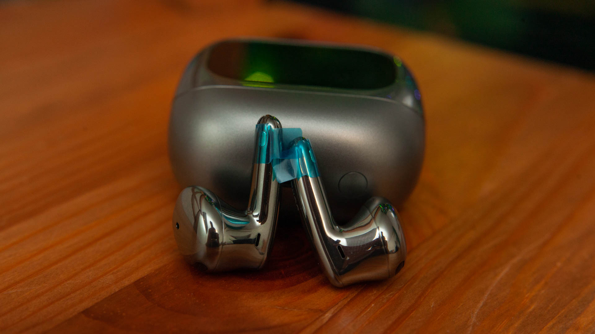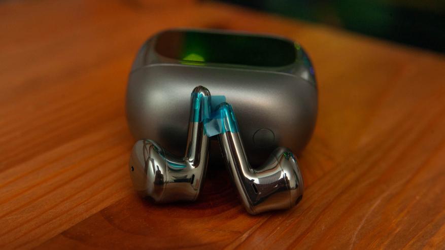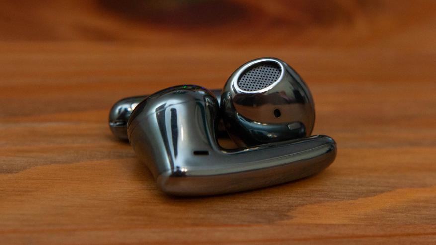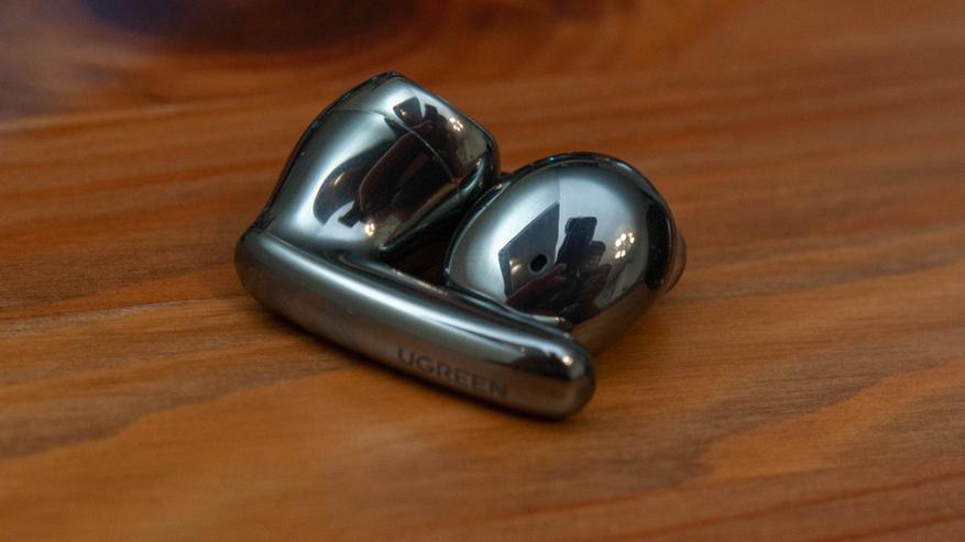 Сами наушники выполнены в распространённом форм-факторе, популяризированном «яблочными» эйрподсами. Чего скрывать, серебристый цвет мне не особо под душе, я бы предпочёл тот же самый матово-серый цвет, что и у кейса. 3 отверстия в каждом наушнике, которые вы можете увидеть на фото — микрофоны для шумодава и разговора. Пластик у них обоих без каких-либо дефектов литья. Впрочем, не вижу причин ожидать чего-то подобного от Ugreen.