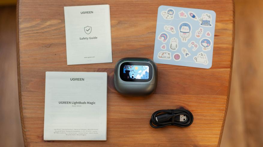 Внутри, как это заведено у Ugreen (а может и у других производителей) — еще одна коробка с полуоткрытой стороной, в которой покоится кейс с наушниками. Так как наушники заточены под молодёжную аудиторию, то обычный набор из макулатуры и кабеля зарядки дополняется и листком с ми-ми-ми наклейками.