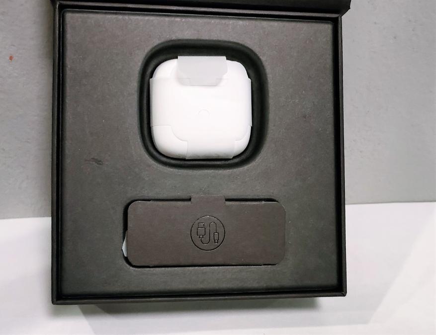 Теперь нам следует поднять конверт, а за конвертом в прочных пластиковых нишах вложен кейс, внутри которого спрятались сами наушники, а также коробочка с индикацией о том, что там лежит кабель. Действительно, в коробочку положили кабель в индивидуальном пакетике. В комплекте для зарядки используется кабель USB-TypeC