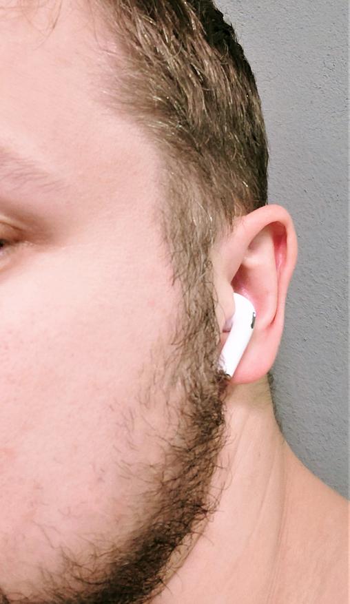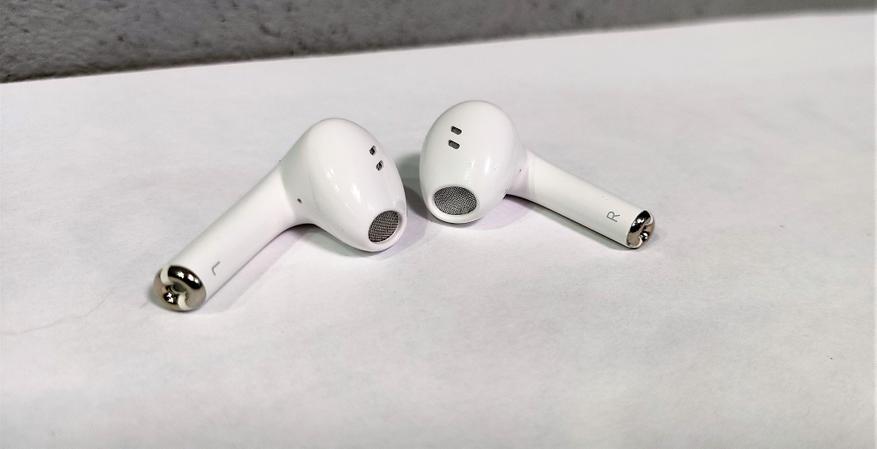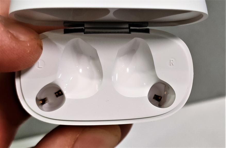 Вкладыши выделяются глянцевым белым корпусом, а также сразу заметно, что они имеют укороченную ножку длиной 1.5 сантиметра. На внутренних сторонах ножек, написанный каналы звука, правый или левый. На концах хромированные металлические вставки для зарядки. 2 металлические вставки двумя половинками образуют круг, а внутри круга расположили микрофоны, прикрытые металлическими сетками. Звуководы овальной формы, также прикрыты металлической сеткой.