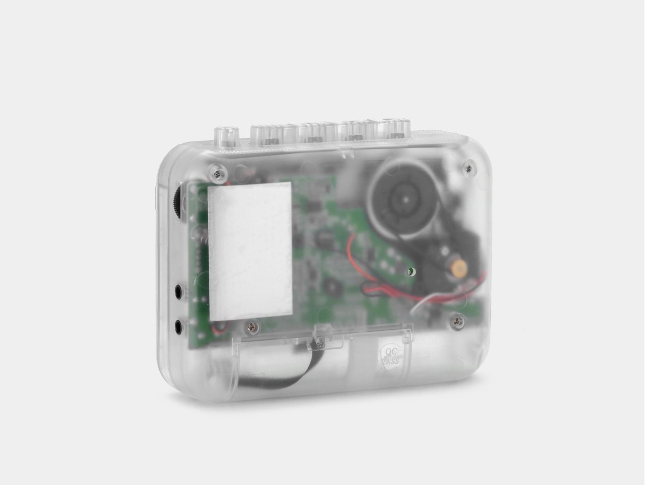 Плеер оснащен прозрачным пластиковым корпусом, через который видны внутренние механизмы. Устройство поддерживает основные функции работы с кассетами: воспроизведение, перемотку вперед и назад, а также запись звука. В конструкции предусмотрен разъем для микрофона, позволяющий записывать аудио с внешних источников через линейный вход.