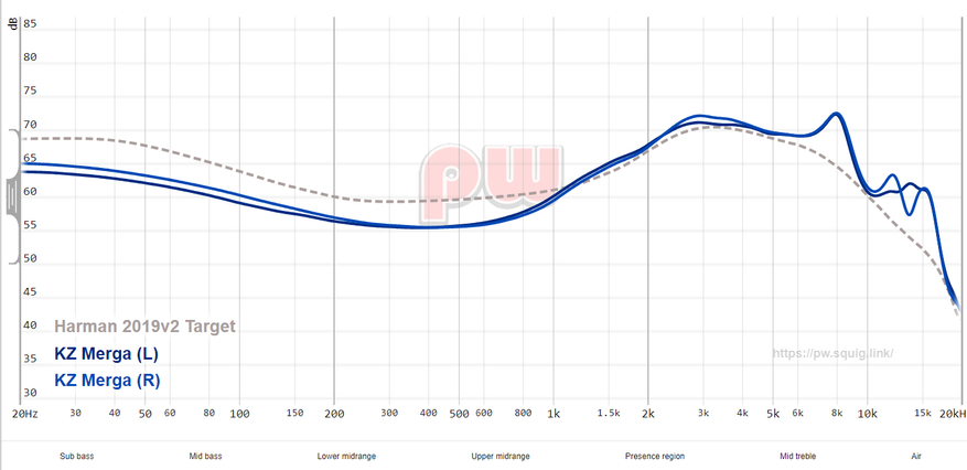 На этот раз Kитайские Zвукачи немного отошли от своего фирменного V-образного звучания и сделали звучание подходящее под целевую кривую Harman Traget только в области перехода к высоким частотам, слегка усилив высокие пиком детализации на 8 КГц. Количество баса и средних частот заметно ослаблено.