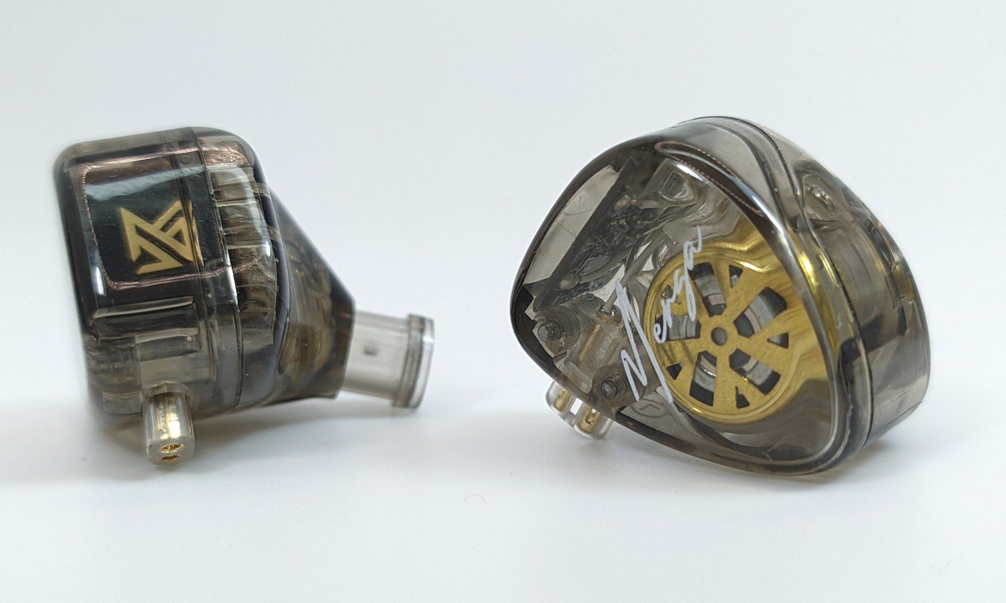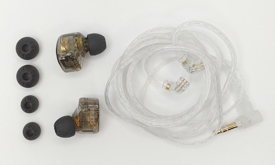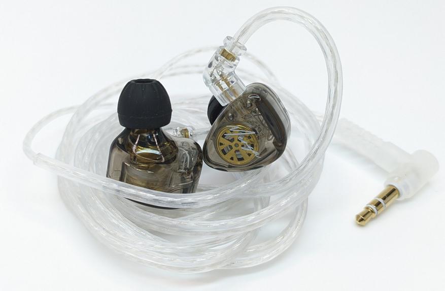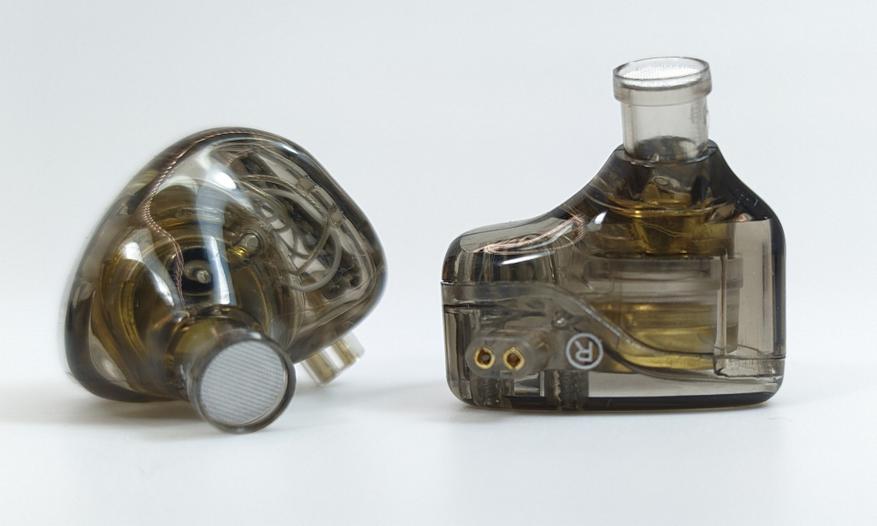 Полностью пластиковые прозрачные корпуса, через которые видно, как наушники устроены внутри. QDC 0.75 мм разъем для подключения кабеля. Компенсационное отверстие одно. Динамики располагаются один над другим, от камеры нижнего динамика есть акустическая трубка в камеру верхнего динамика. На звуководах вместо сеток установлены акустические фильтры.