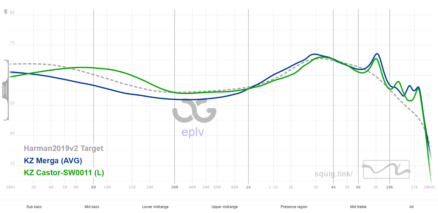 Учитывая стоимость этих наушников, к средним и высоким частотам по их качеству я тоже не могу придраться. Все звучит вполне нормально, но высокие частоты могут вызвать вопросы, особенно у тех, кто слышал, например, KZ Castor, которые стоят примерно столько же. Если Merga имеют несколько смазанные, а точнее, как бы расщепленные и не четкие атаки и могут немного отдавать песочком на шлейфах перкуссионных, то Castor справляются с этим гораздо лучше. Тем более, что у Castor не такая проваленная середина относительно ВЧ и гораздо больше баса. Но Castor это уже однозначно хит бюджетного сегмента и эталонное звучание в этом сегменте. Кончено со своими компромиссами и не для всех, но для многих точно.