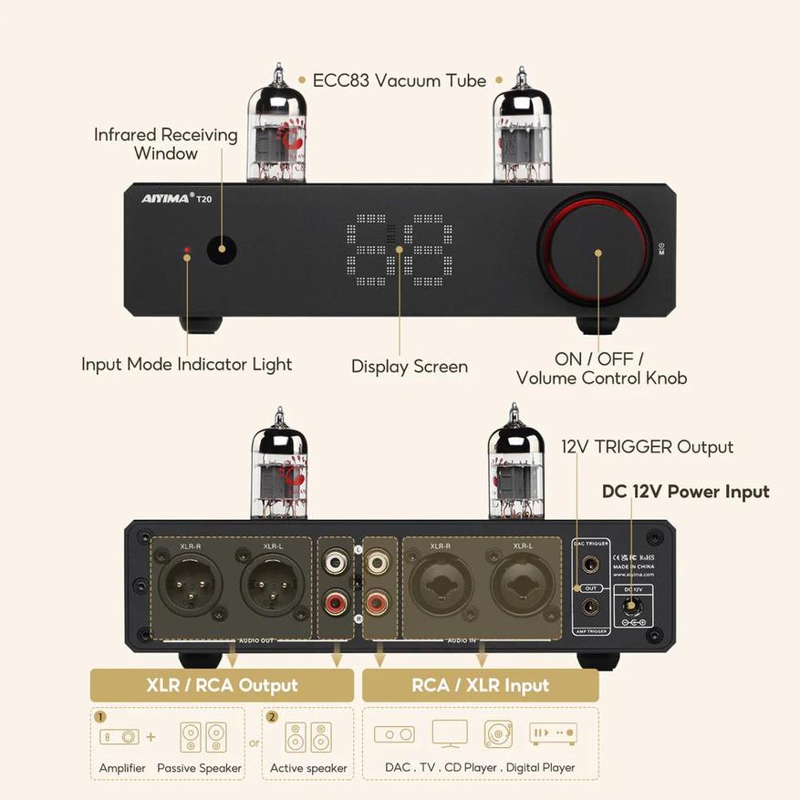 Чётные гармоники, которые привносят лампы в звучание, создают тот эффект «теплоты» звуковой подачи в аудиотехнике. Китайский бренд AIYIMA представил ламповый предварительный усилитель с современной схемотехникой (DSP и 32-битный микроконтроллер) и лампами ECC83 (низкочастотный двойной триод) по пути следования сигнала. Входы и выходы сигнала линейные либо балансные, для управления используется энкодер и пульт ДУ.