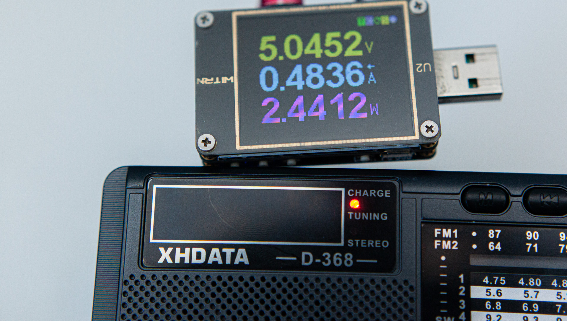 Во-первых, у XHDATA 368 есть (и это чудесно) питание и от USB-C. Сел аккум — не проблема, подключил к повербанк и пользуешь. А можно и без аккума просто радио слушать. И тут максимум увиденной мной мощности — 1.8Вт. Аккум, кстати, можно заряжать прямо в приёмнике! Мощность небольшая, до 2.5Вт, но можно.