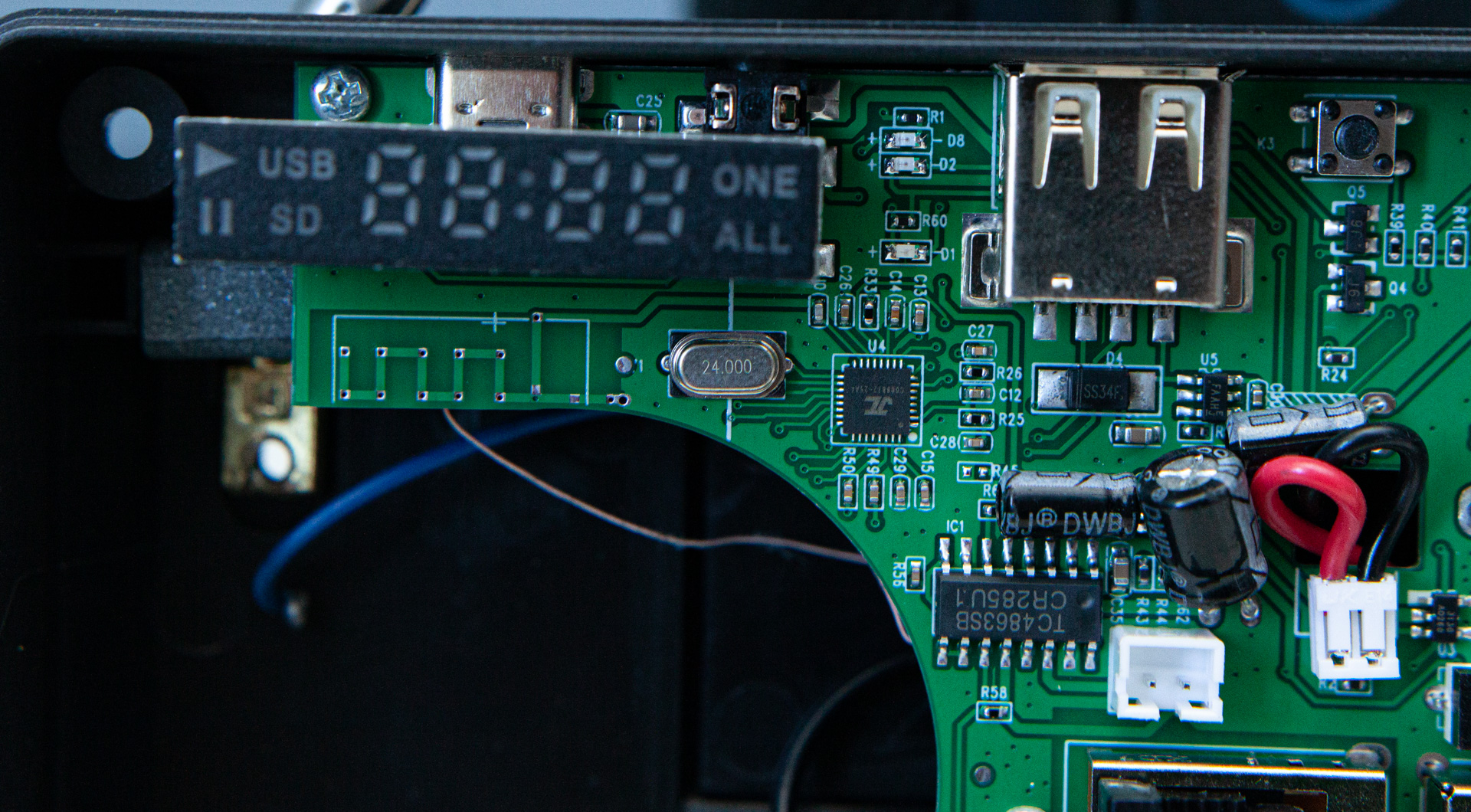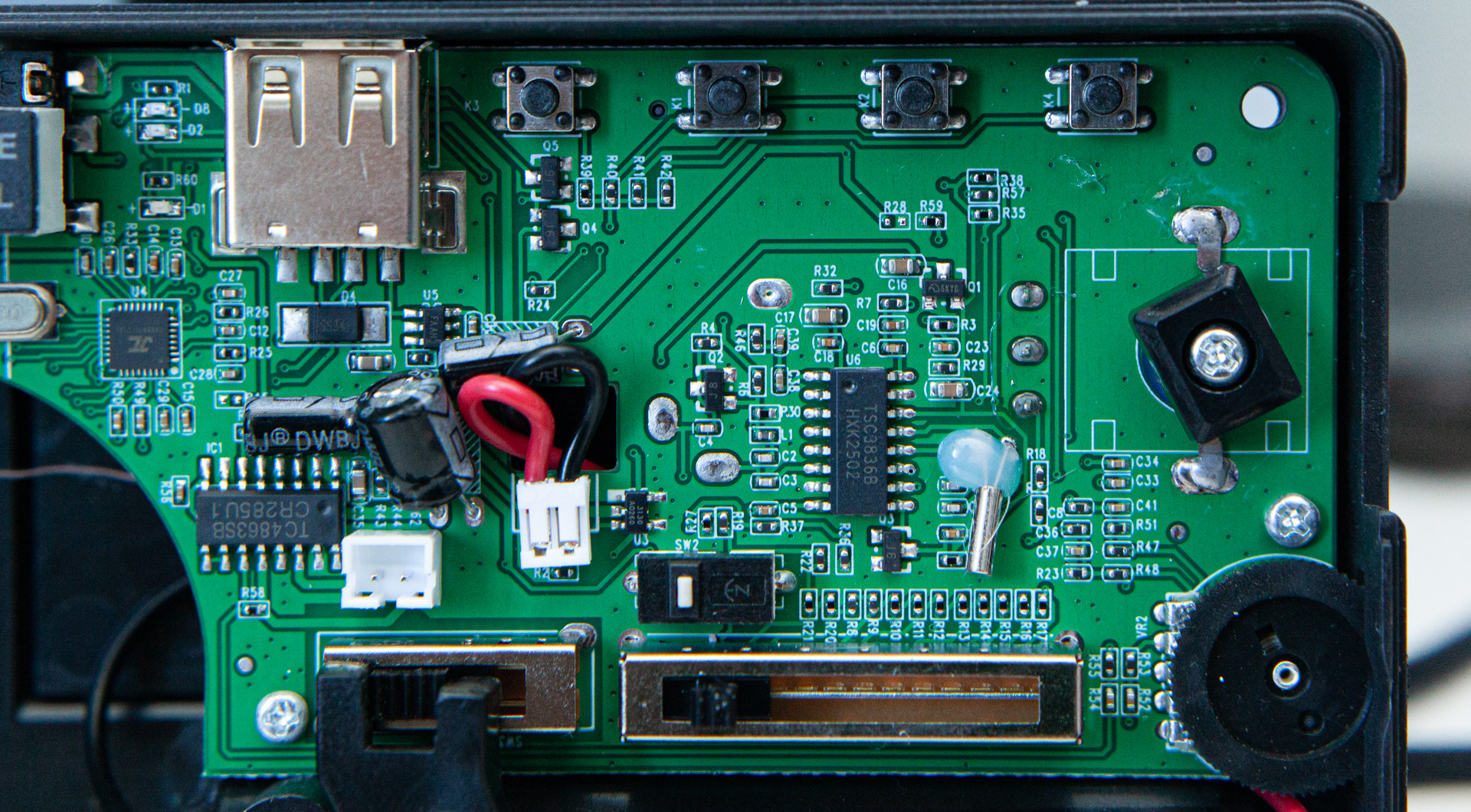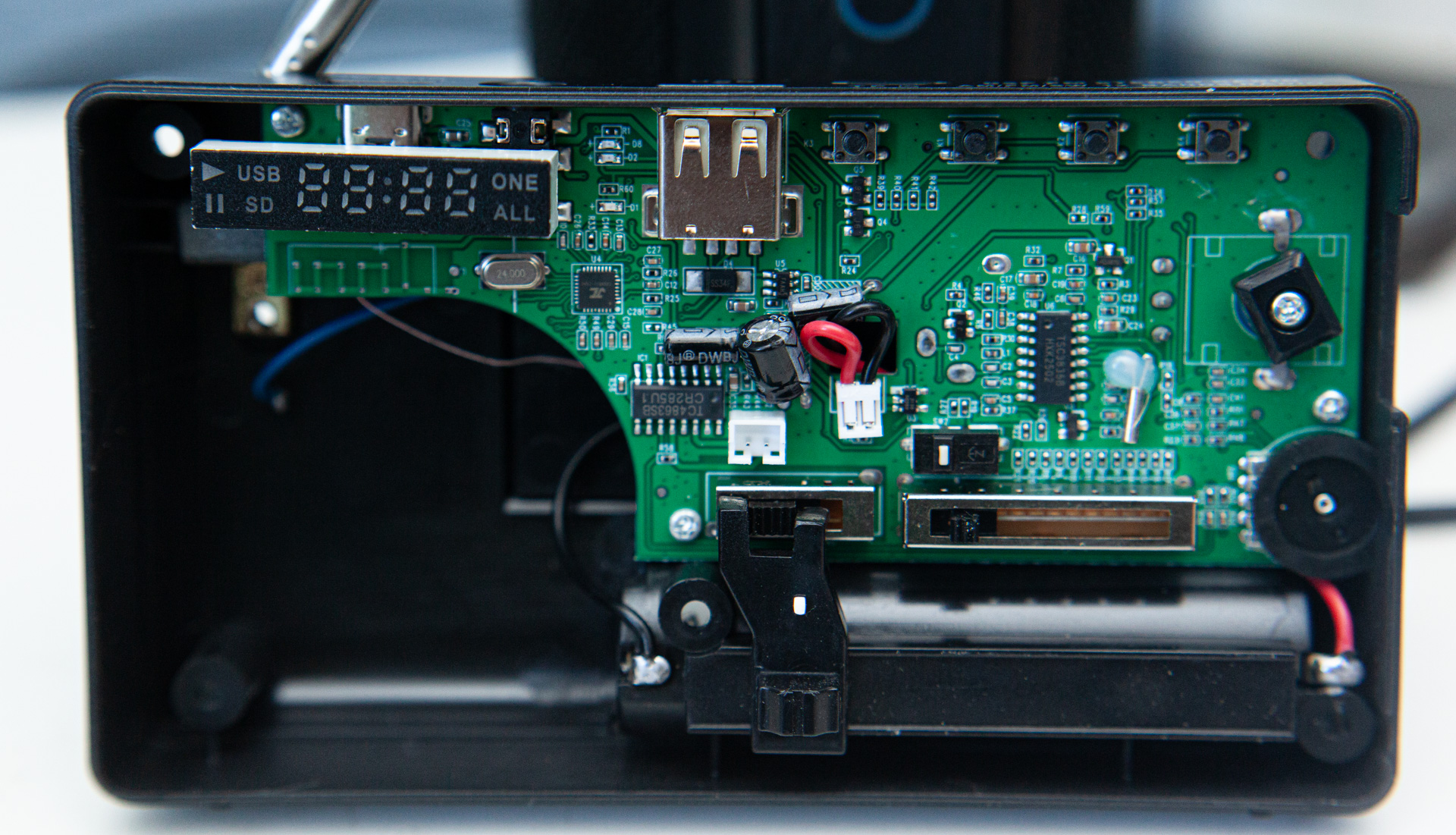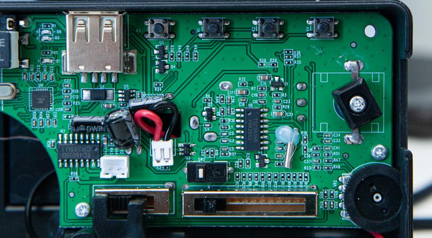За настройку радио отвечает тюнер Skyworks Si4836A в паре с механическим переменным конденсатором. За звук LM4863 — комбайн из усилителя мощности и стереоусилителя для наушников в одном флаконе.