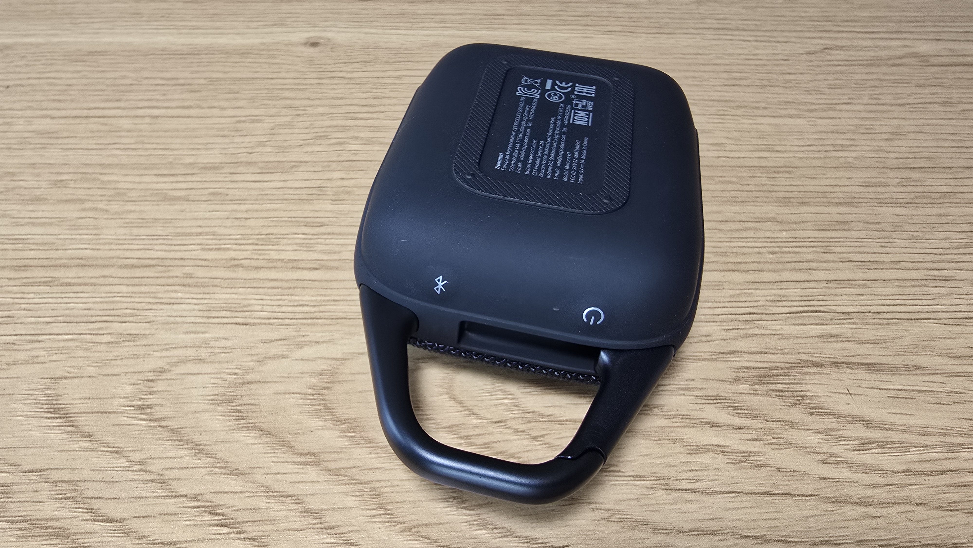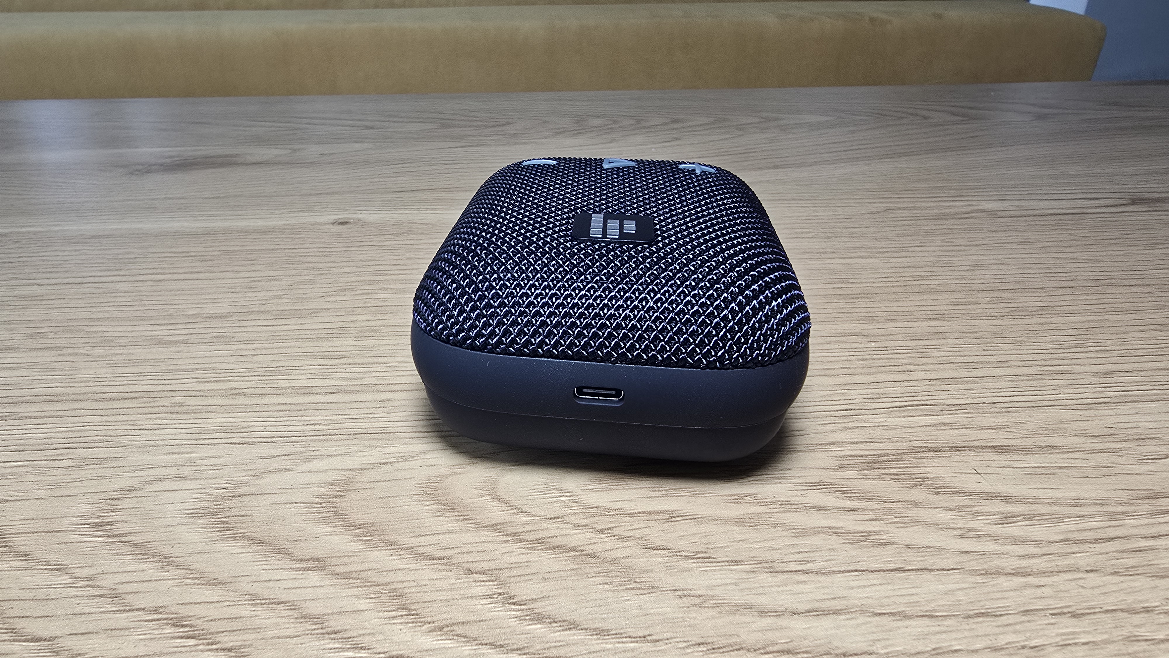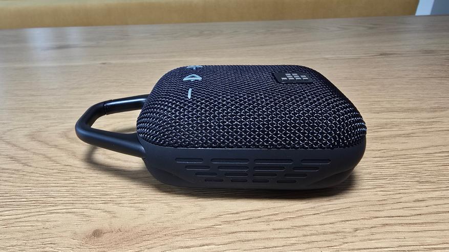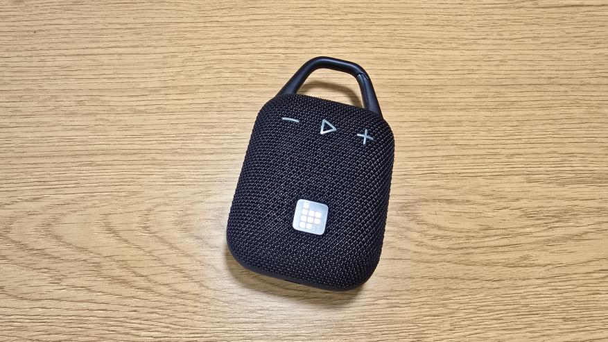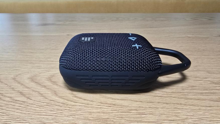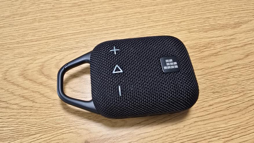 Корпус Tronsmart Mirtune H1 выполнен в строгом и утилитарном стиле. Форма прямоугольная, со сглаженными углами и практически симметричной геометрией, что делает устройство визуально сбалансированным. Передняя часть покрыта плотной тканевой сеткой, под которой скрыт основной динамик. Ткань плотная, с выраженной текстурой, равномерно натянута и не провисает. Центральное место занимает квадратный логотип в виде пиксельной решетки, выделенный на фоне материала за счет глянцевой вставки. На верхней плоскости размещены три выпуклые кнопки: «минус», «пауза/плей» (в виде треугольника) и «плюс». Символы крупные, нанесены контрастной краской и легко читаются под любым углом. Кнопки чуть возвышаются над тканью и обладают выраженным механическим ходом при нажатии. Их форма и расположение позволяют безошибочно определять нужную функцию на ощупь, даже не глядя.