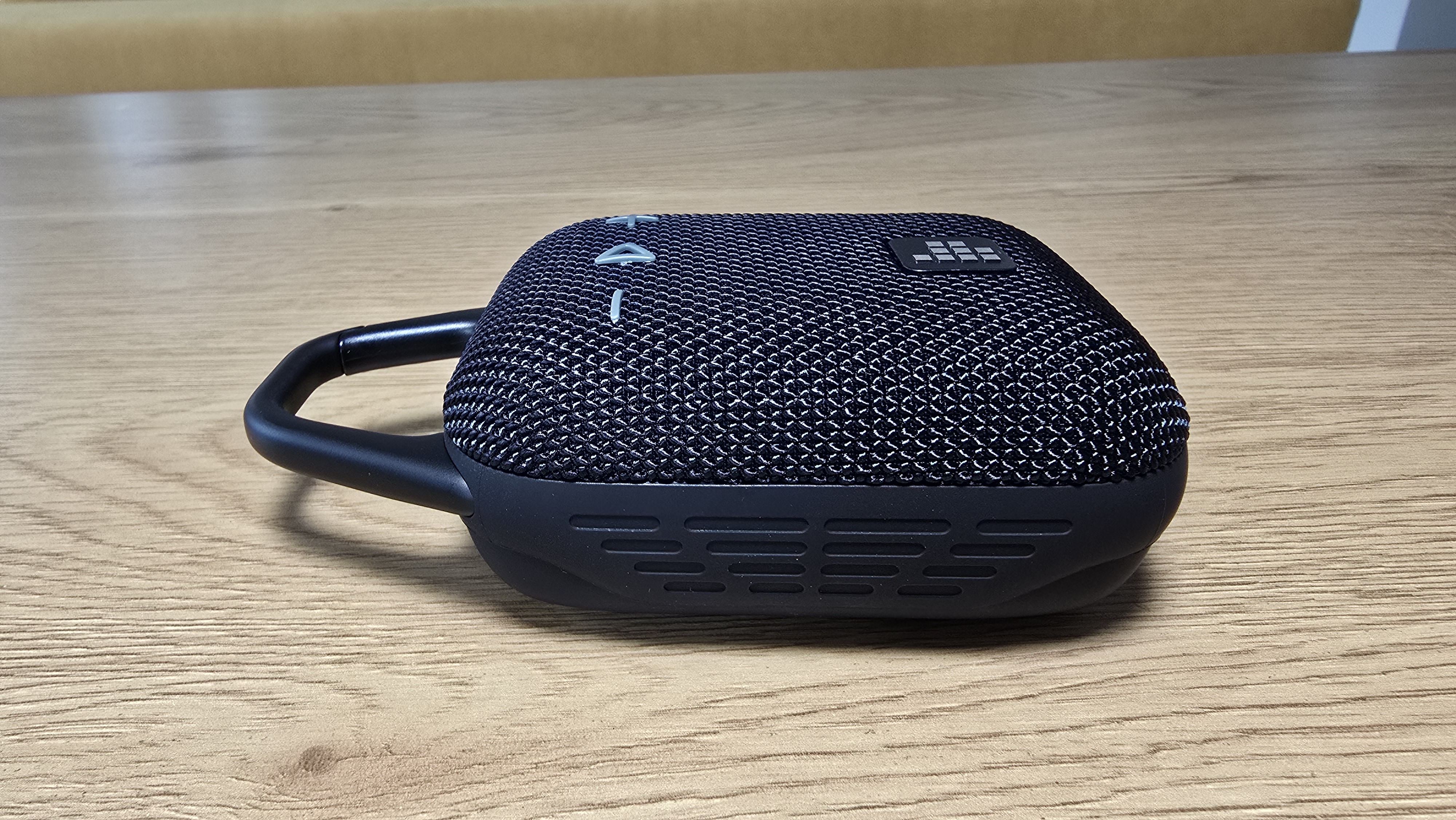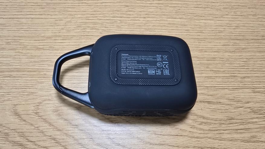 Отдельного внимания заслуживает карабин: он визуально воспринимается как часть корпуса. Выполнен из металлической трубки, он образует жесткую петлю, интегрированную в верхнюю грань. Крепление выглядит аккуратно, никаких следов облоя или зазоров. Соединение с корпусом не вызывает доверия в плане долговечности, но для массы самой колонки этого достаточно. С точки зрения геометрии устройство висит ровно, не заваливаясь ни в одну из сторон.