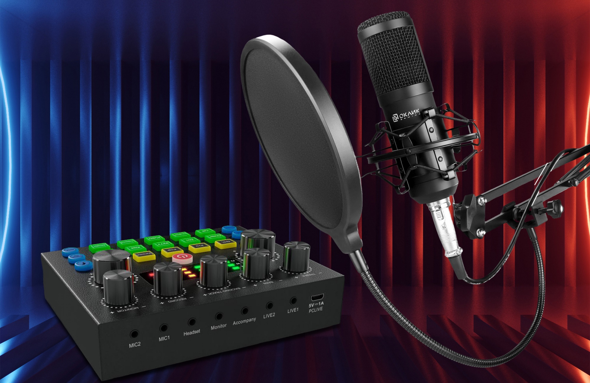 Комплект оборудования для стримов и записей студийного качества от ОКЛИК: микрофон SM-600G с цифровым выходом (USB), микшерный пульт на 2 канала, пантограф с антивибрационным креплением и поп-фильтром. Подобный комплект позволяет буквально без опыта и «со старта» записывать подкасты, озвучку для видеороликов без дополнительного оборудования.