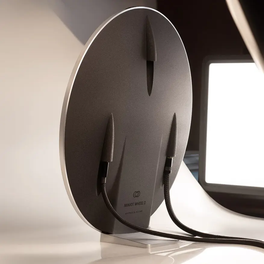 Семейная компания Miniot из Нидерландов представила третье поколение своего вертикального проигрывателя виниловых пластинок Wheel. Новая модель Wheel 3 оснащена инновационной оптической системой считывания звука вместо традиционных магнитных датчиков.