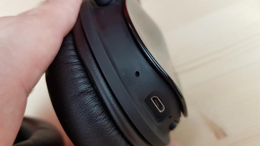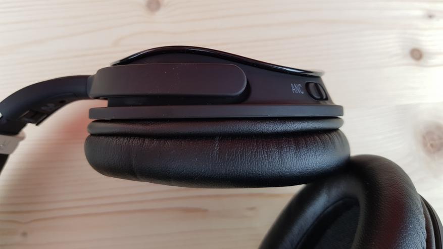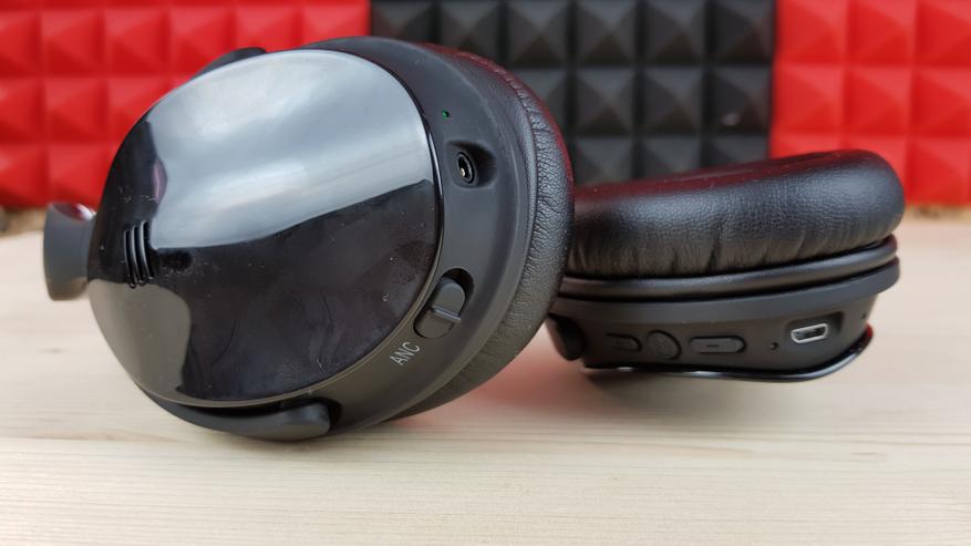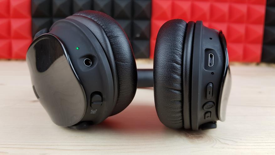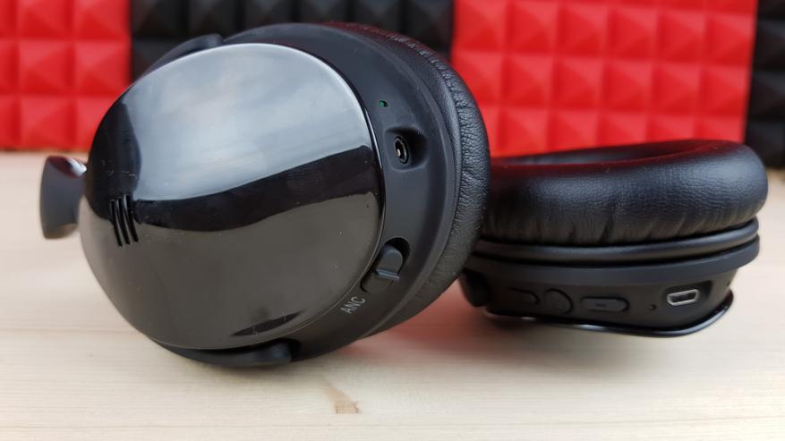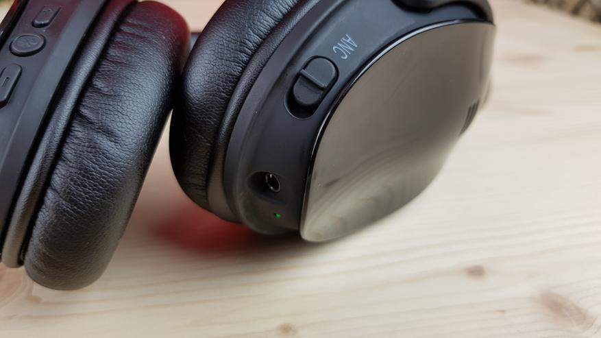 Справа находится переключатель ANC для включения системы шумоподавления, индикаторный светодиод и 3.5 мм разъем для AUX кабеля. Тут важно понимать, что при подключении кабеля наушники перестают быть гарнитурой, однако питание им в этом случае не нужно. Ну разве что для шумодава, который работает при любых типах коммутации. На одном заряде наушники способны играть до 18 часов, а с шумодавом — до 12.