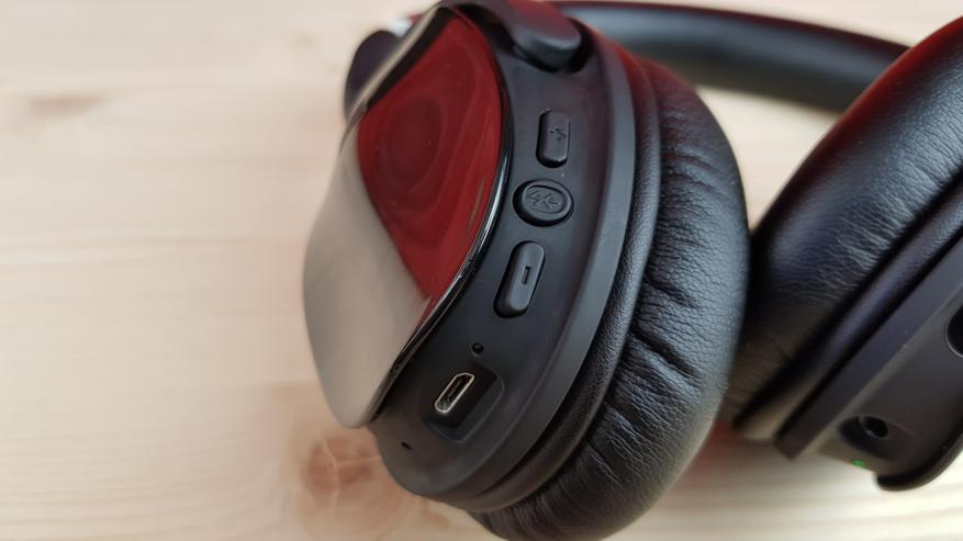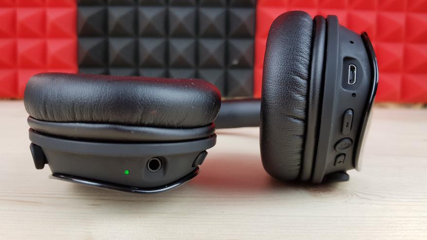Левая чашечка ответственна исключительно за работу блютуз модуля. Здесь расположены три функциональные кнопки, индикаторный светодиод, порт MicroUSB и разговорный микрофон. Средняя кнопка включает наушники, ставит музыку на паузу и отвечает на звонок. Две боковые, стандартно, отвечают за изменение громкости и переключение треков.