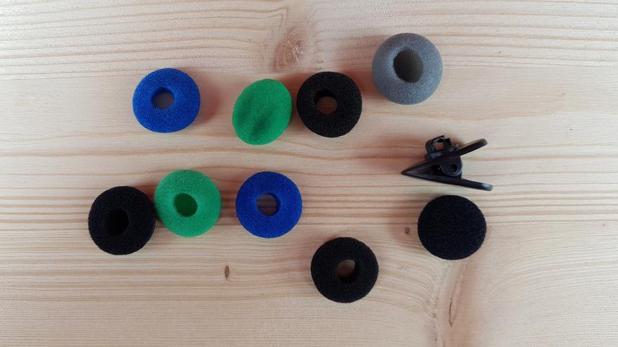 Тут же, в пластиковом пакете, находится целая россыпь амбушюр разного колера и прищепка для крепления кабеля к одежде.